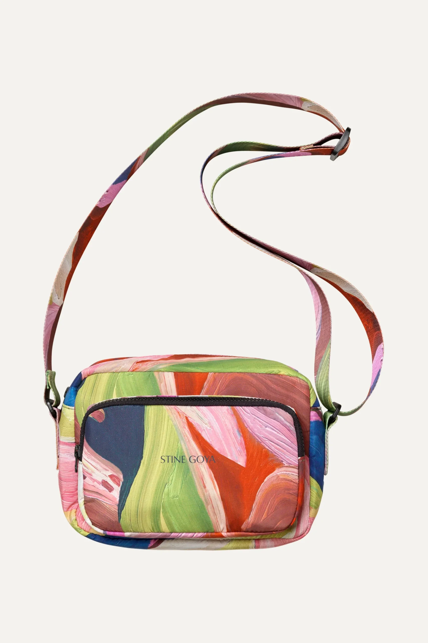 Versatile squared cross body bag with spacious pocket, wide adjustable strap and abstract floral pattern. Pair with your favourite look from the collection.