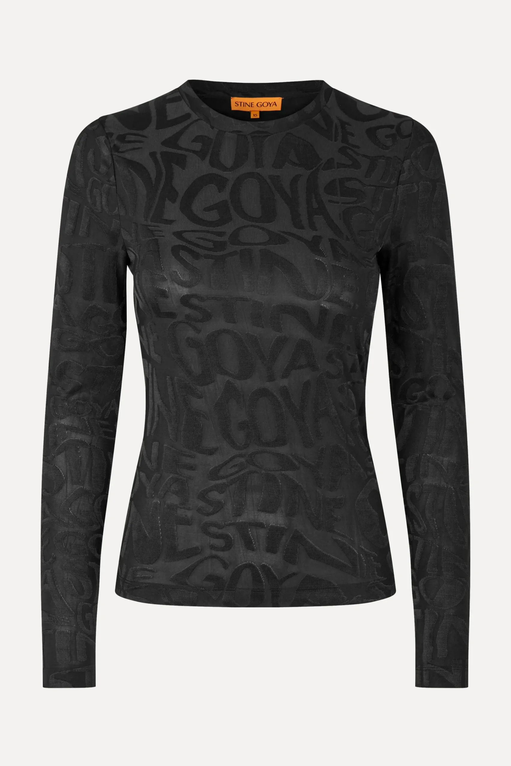 Slim fit, stretchy top with crewneck and long sleeves in lightweight, sheer fabric featuring a burnout Stine Goya logo in monochrome Black.