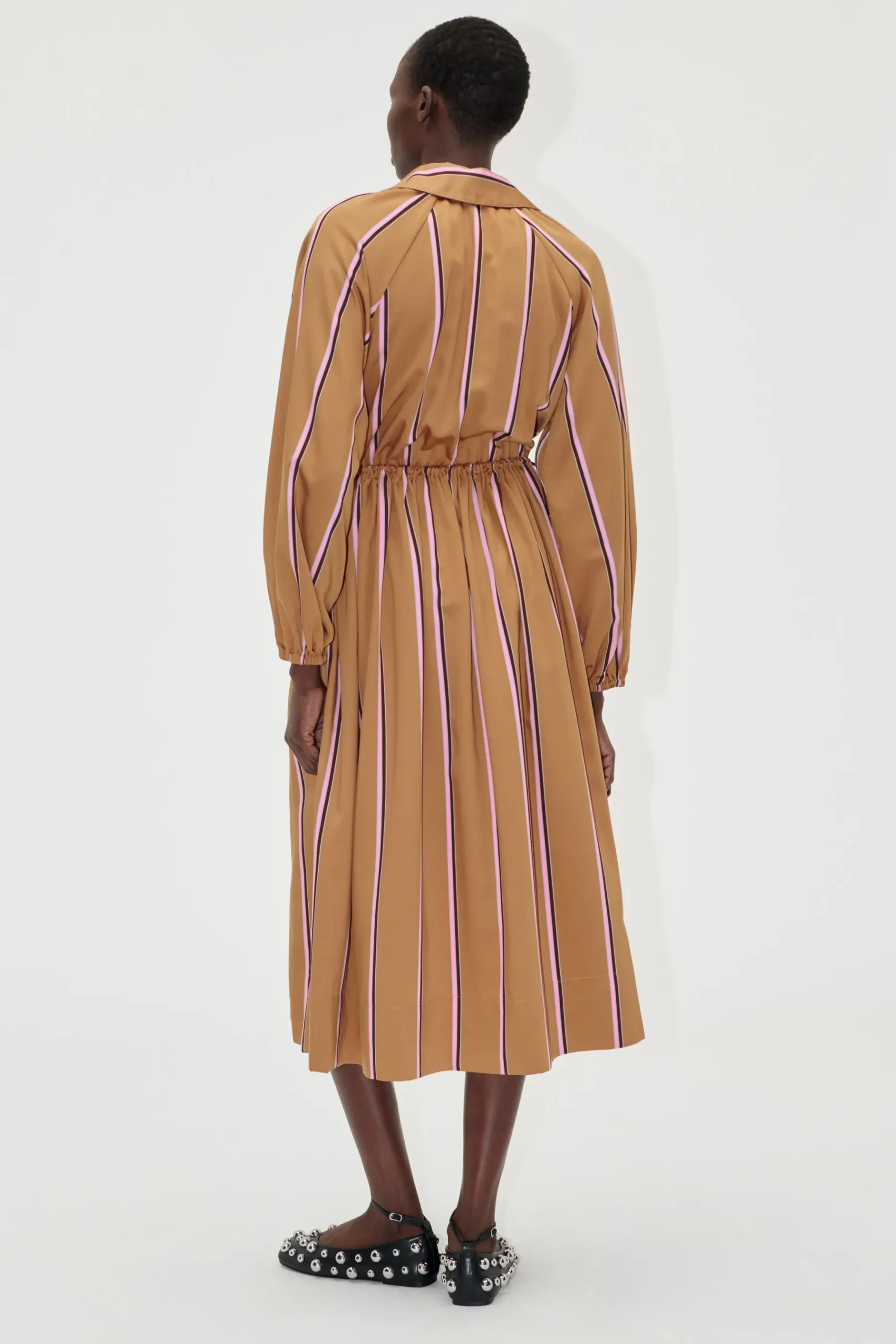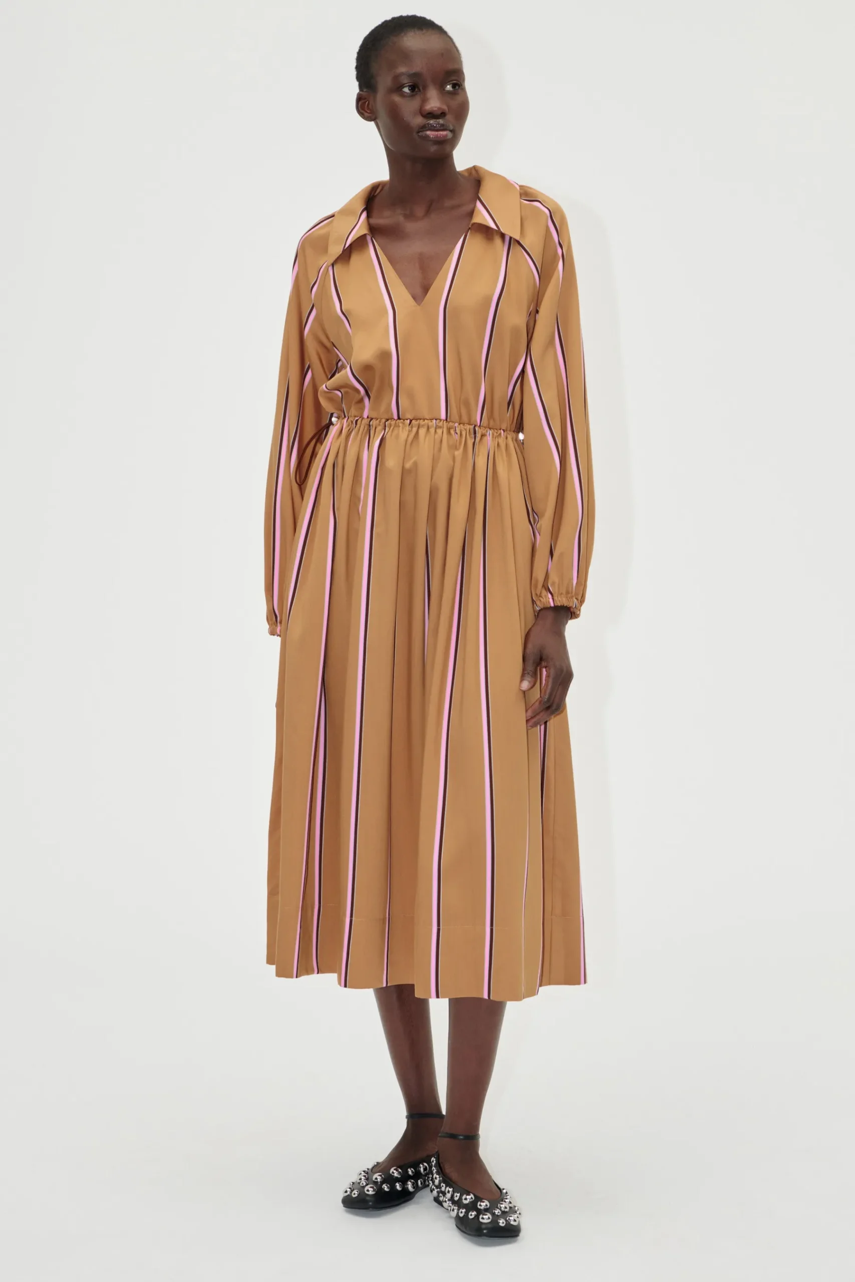 Striped long sleeve midi dress with side pockets, collared V-neck and cinchable elasticated waist. Pair with the Studded Ballerina Flats in Jet Black.
