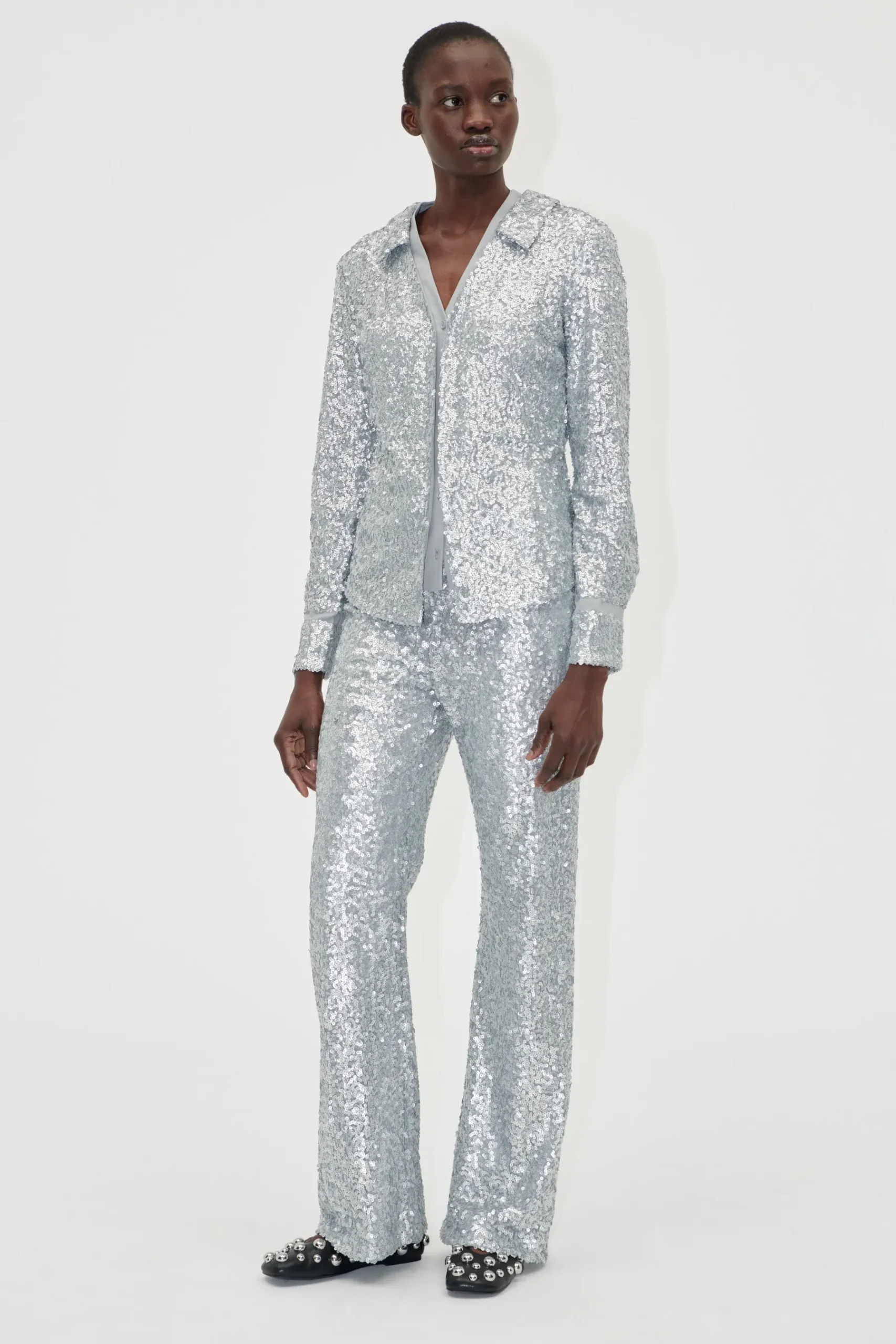 Playful straight-leg pants adorned with silver metallic sequins and featuring a high elasticated waist. Pair them with the Double Collar Shirt in Steel Grey and the Studded Ballerina Flats in Jet Black.
