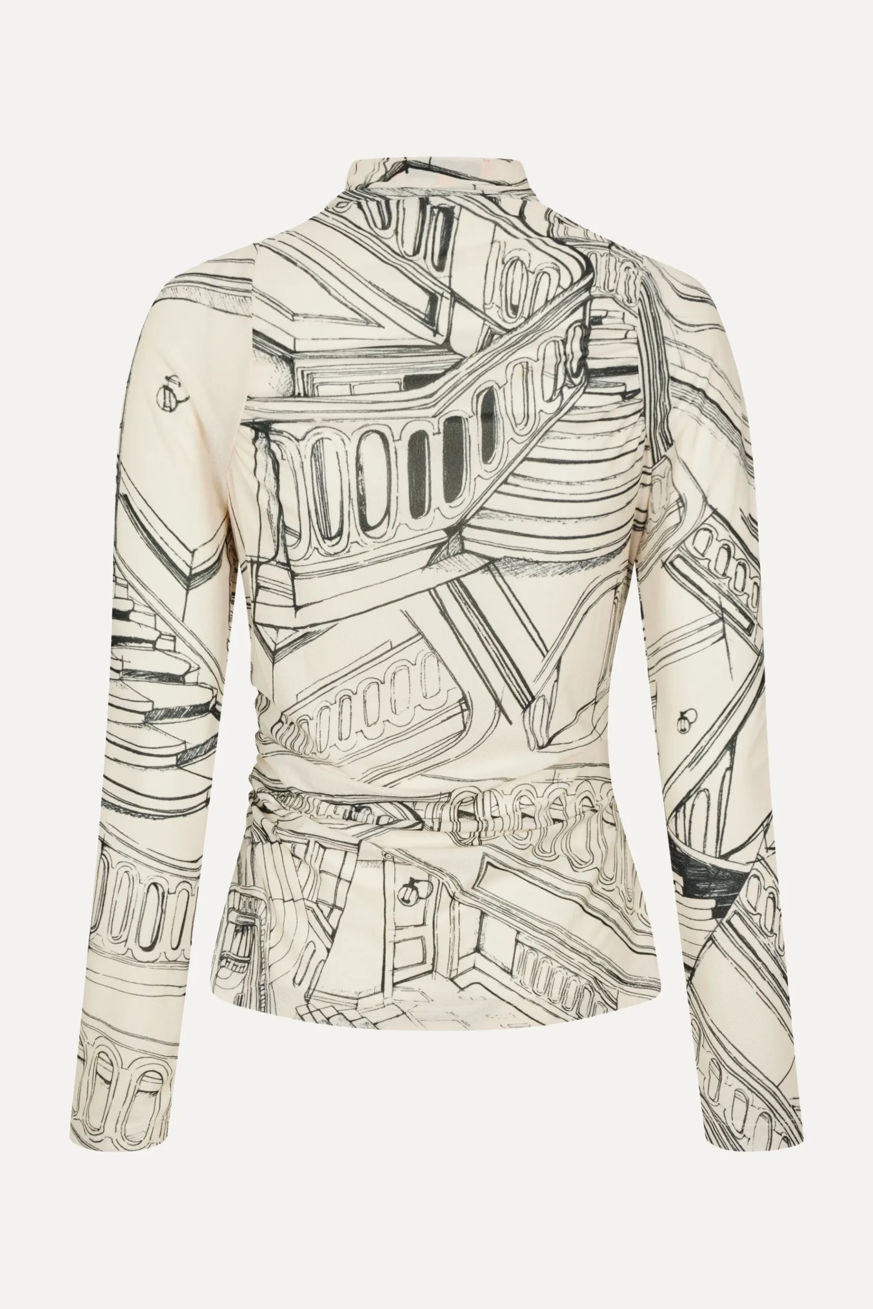 Long sleeve fitted top with a mock turtleneck, flattering ruching and intricate drawn pattern detail. Pair with the Button Slit Detail Midi Skirt in Denim Blue.