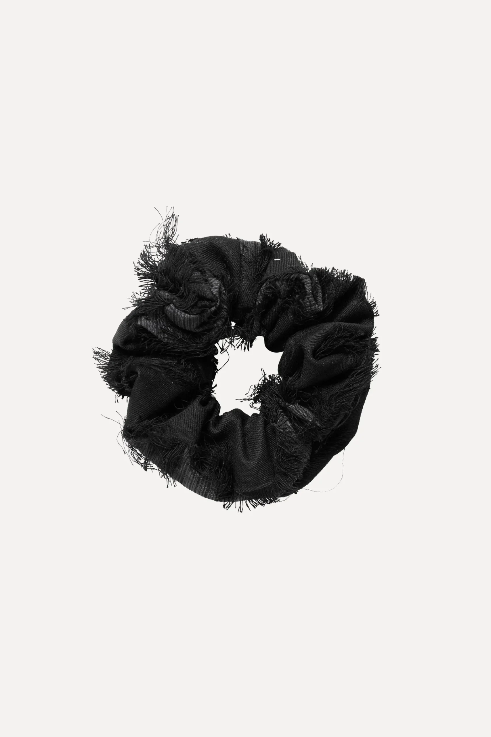 Chic scrunchie detailed with a monochrome distressed pattern on soft material surrounding a comfortable elastic band.