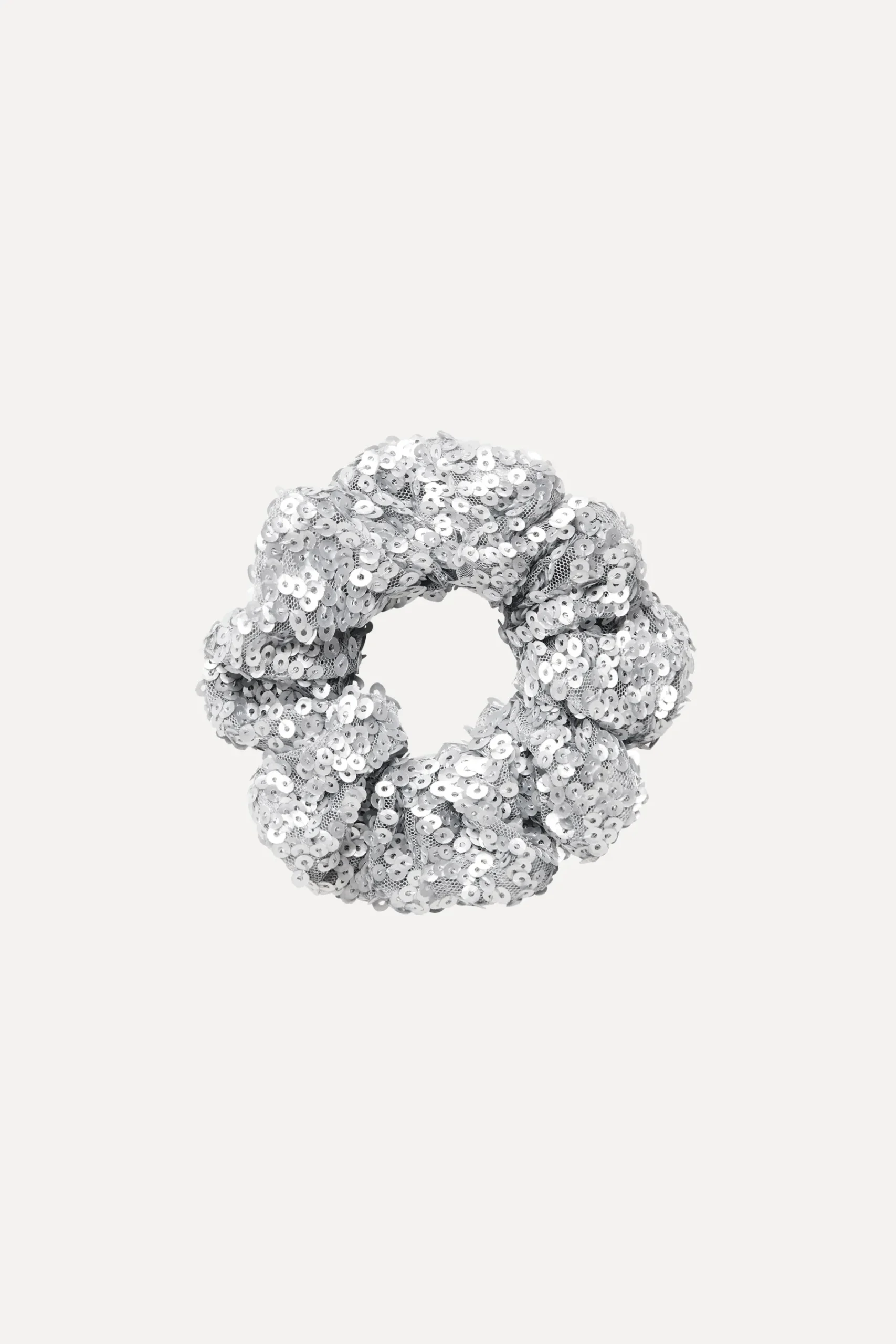 Playful voluminous scrunchie with layered material with metallic sequins bunched around a comfortable elastic band.