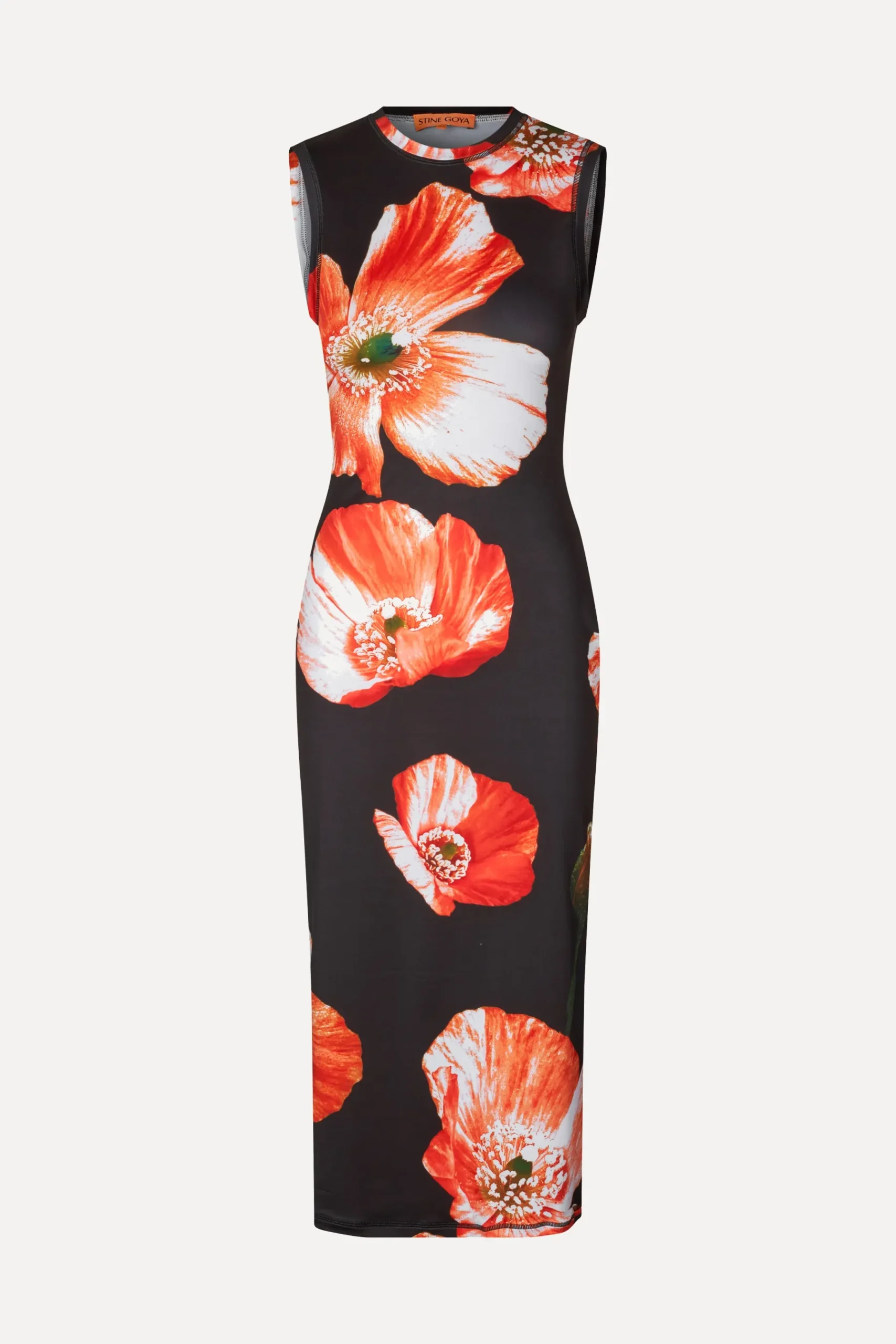 Sleeveless mid-length dress with a fitted silhouette and bright pattern with poppies on soft stretchy material. Pair with your favourite accessories from the collection.