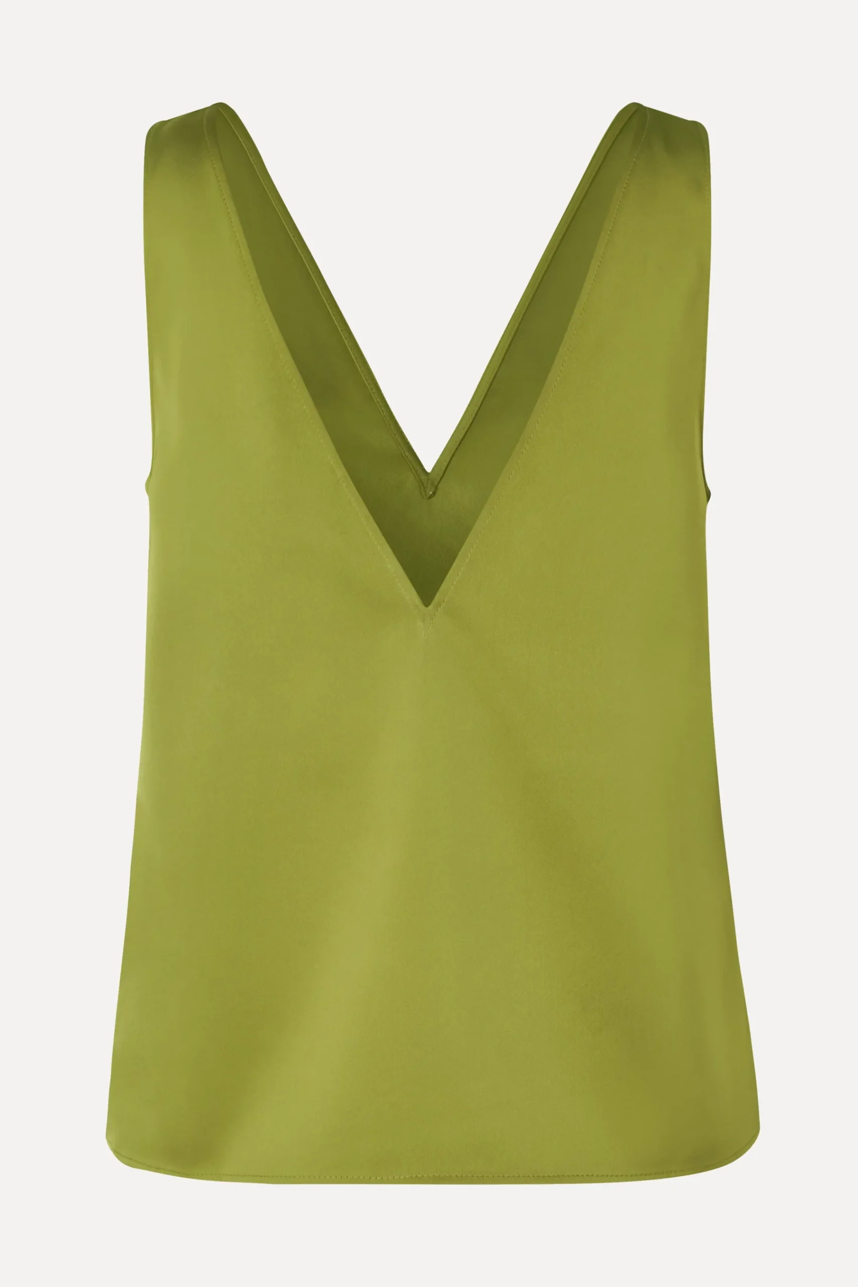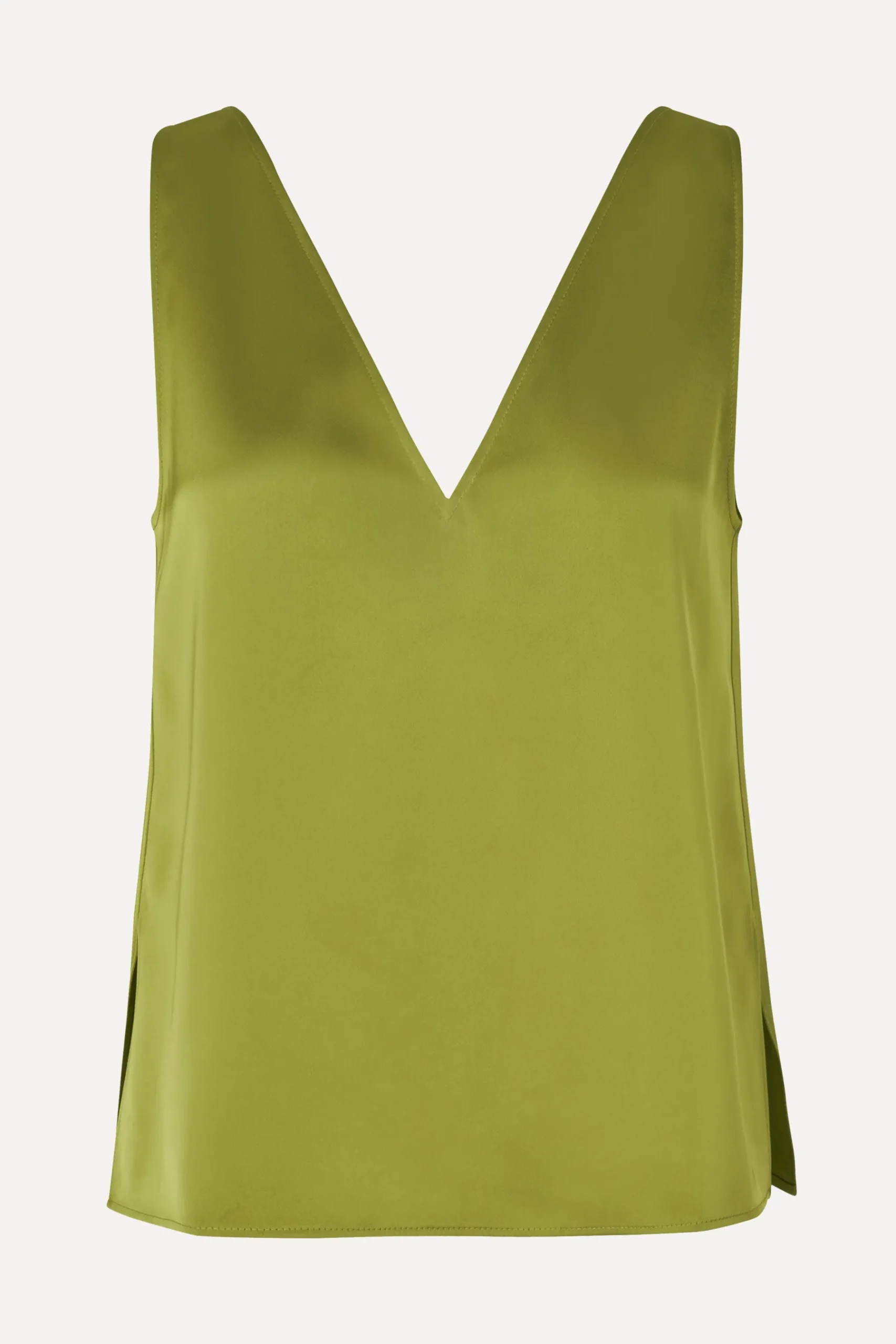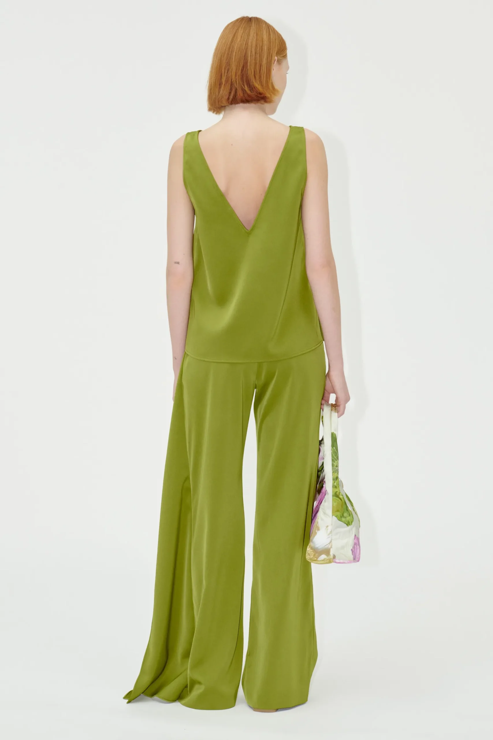 Luxurious and silky sleeveless top with a flowy silhouette, subtle side slit details and deep front and back V-neckline. Pair with the SGGracie Pants in Olive.