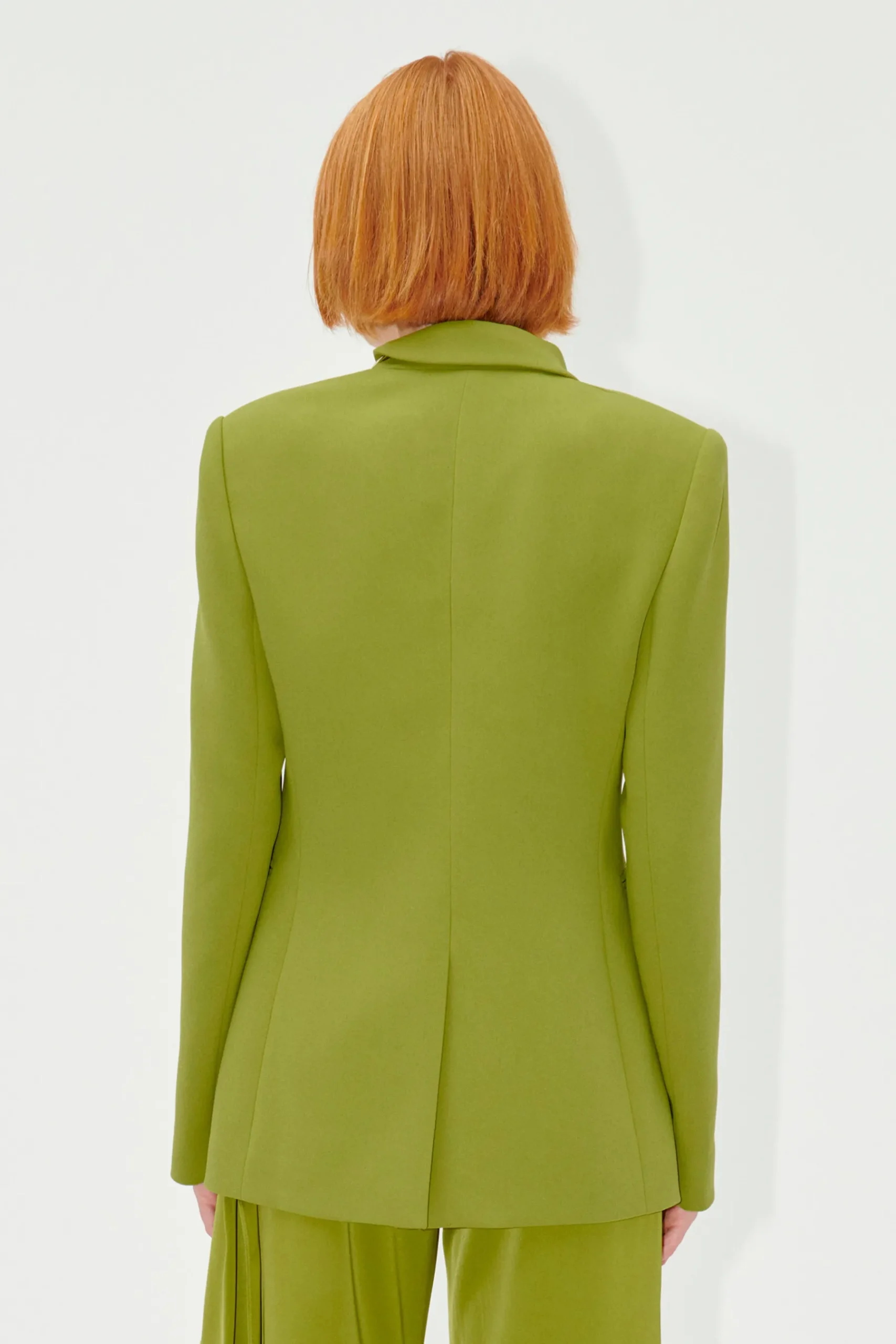 Elegant single breasted blazer with long hem, boxy silhouette and asymmetrical collar with gold necklace detail. Fully lined. Pair with the SGGracie Pants in Olive.