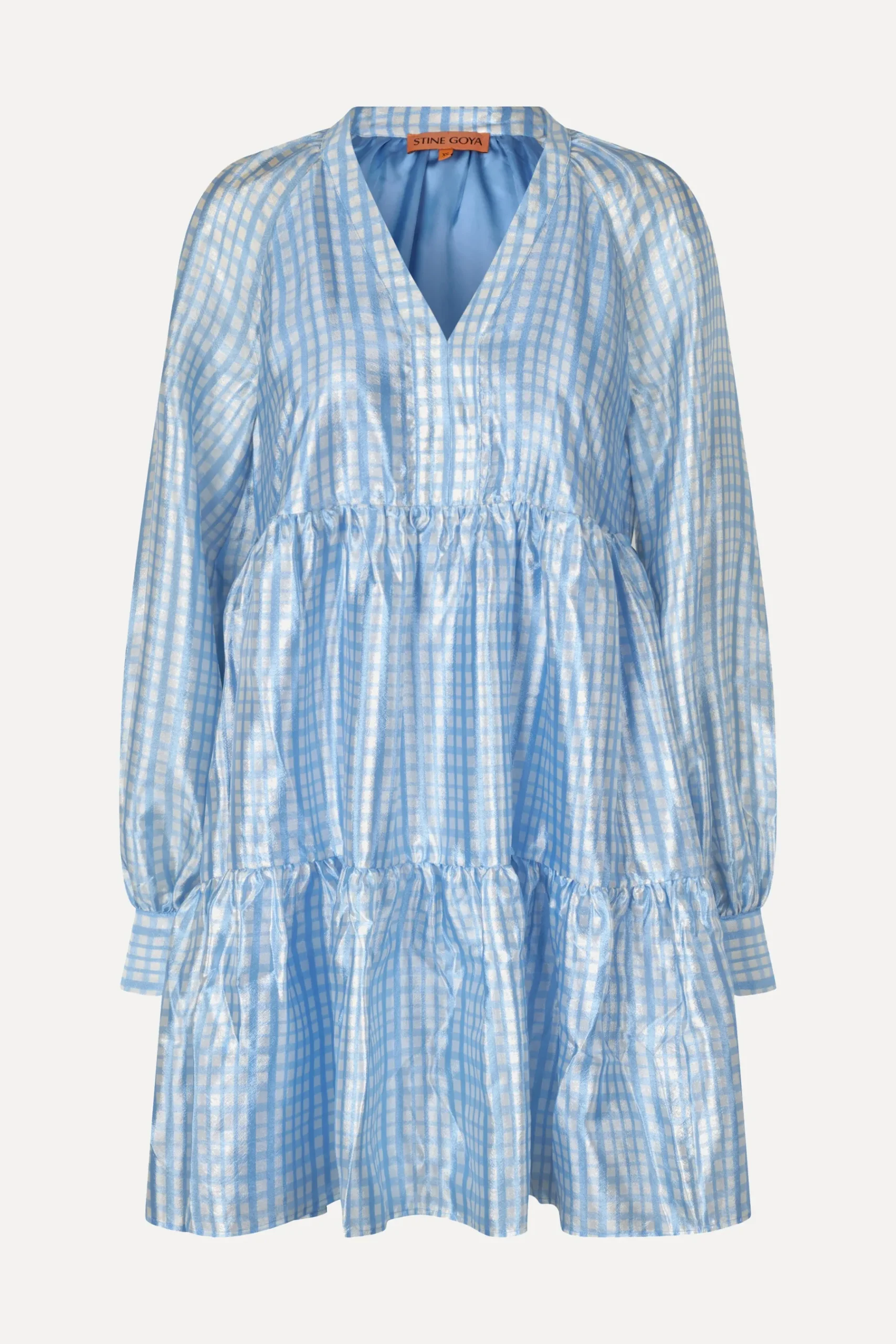 Flowing tiered mini dress with puffed long sleeves, side pockets and sheened material with checked pattern. Pair with the SGStockholm Clogs in Chocolate.