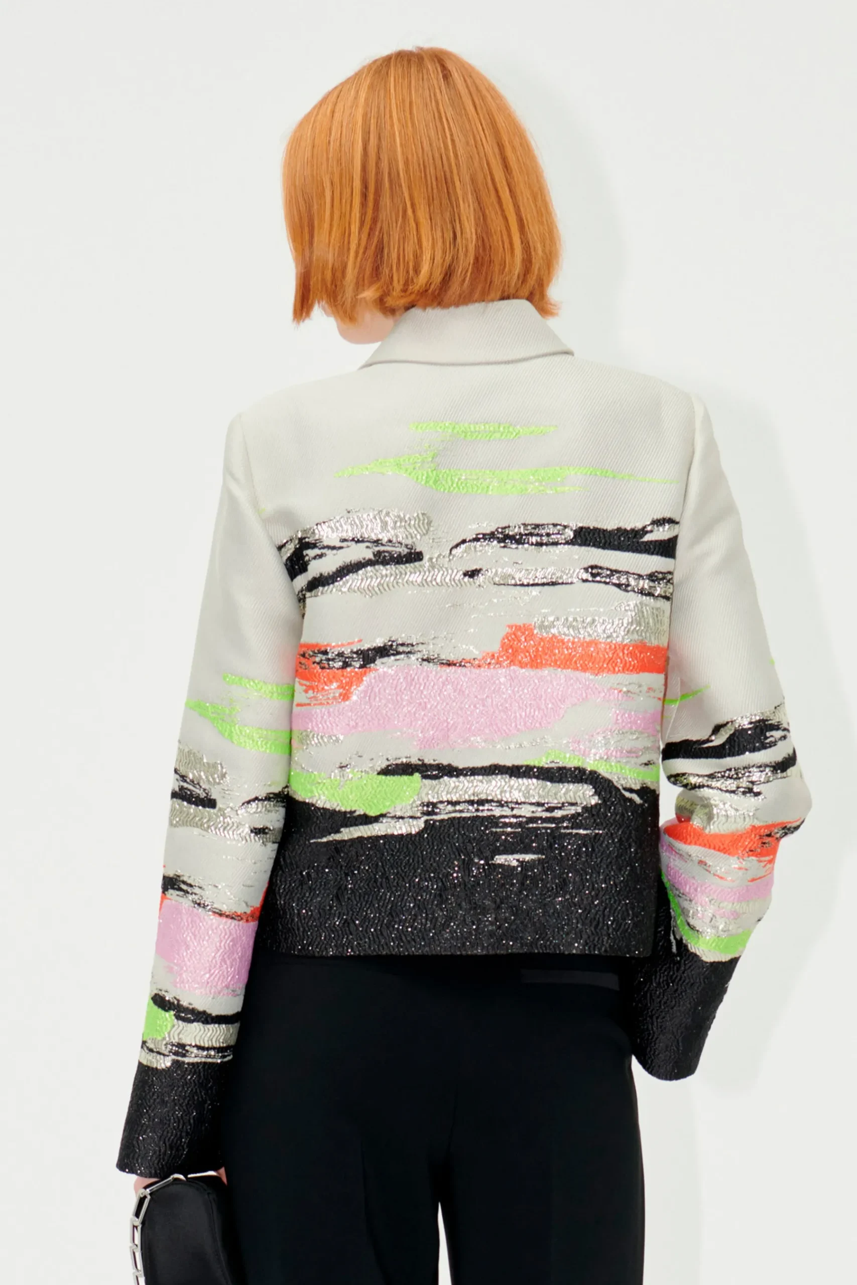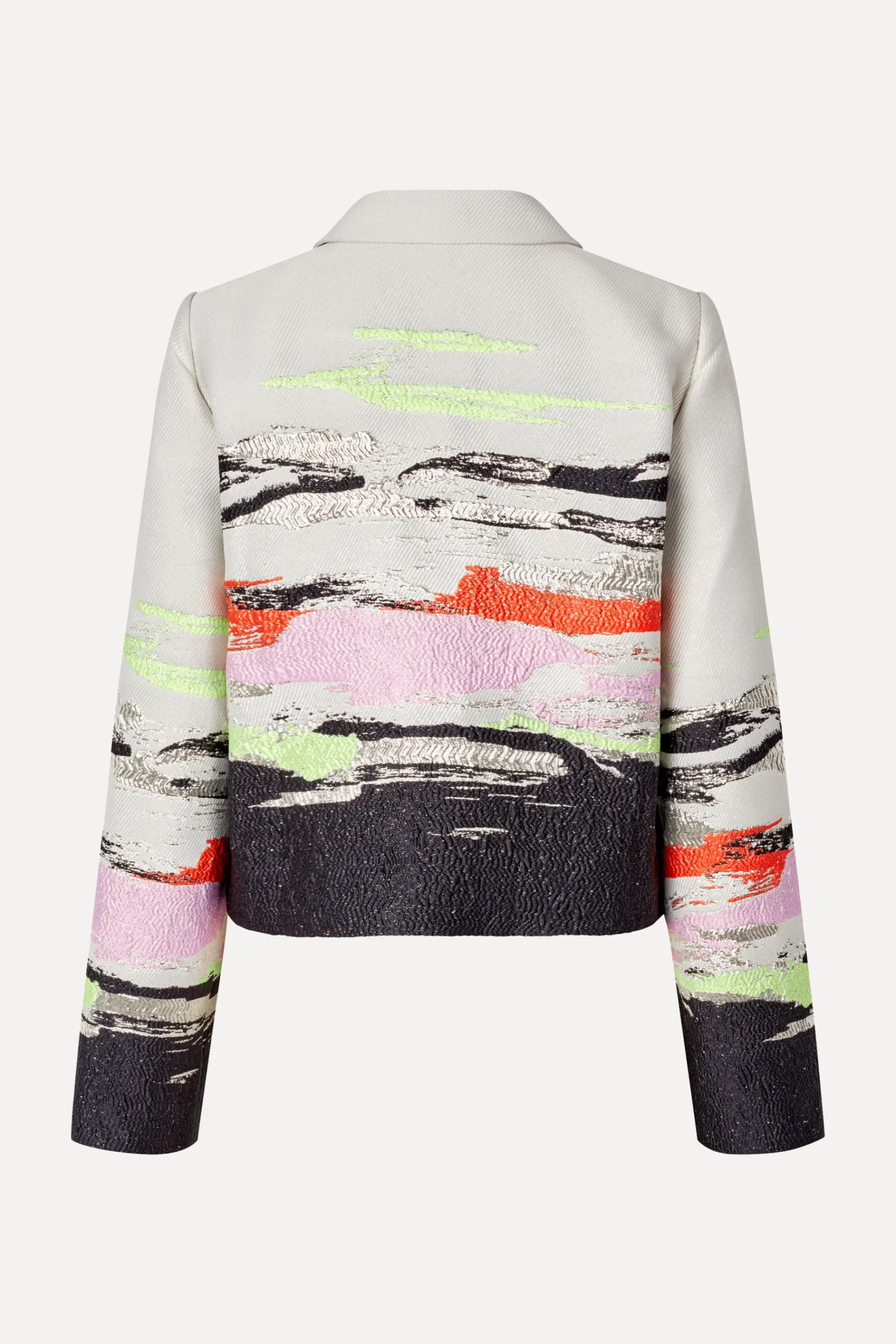 Structured button up jacket with long sleeves, crisp collar and textured abstract metallic pattern. Pair with the SGAsha Pants in Jet Black.