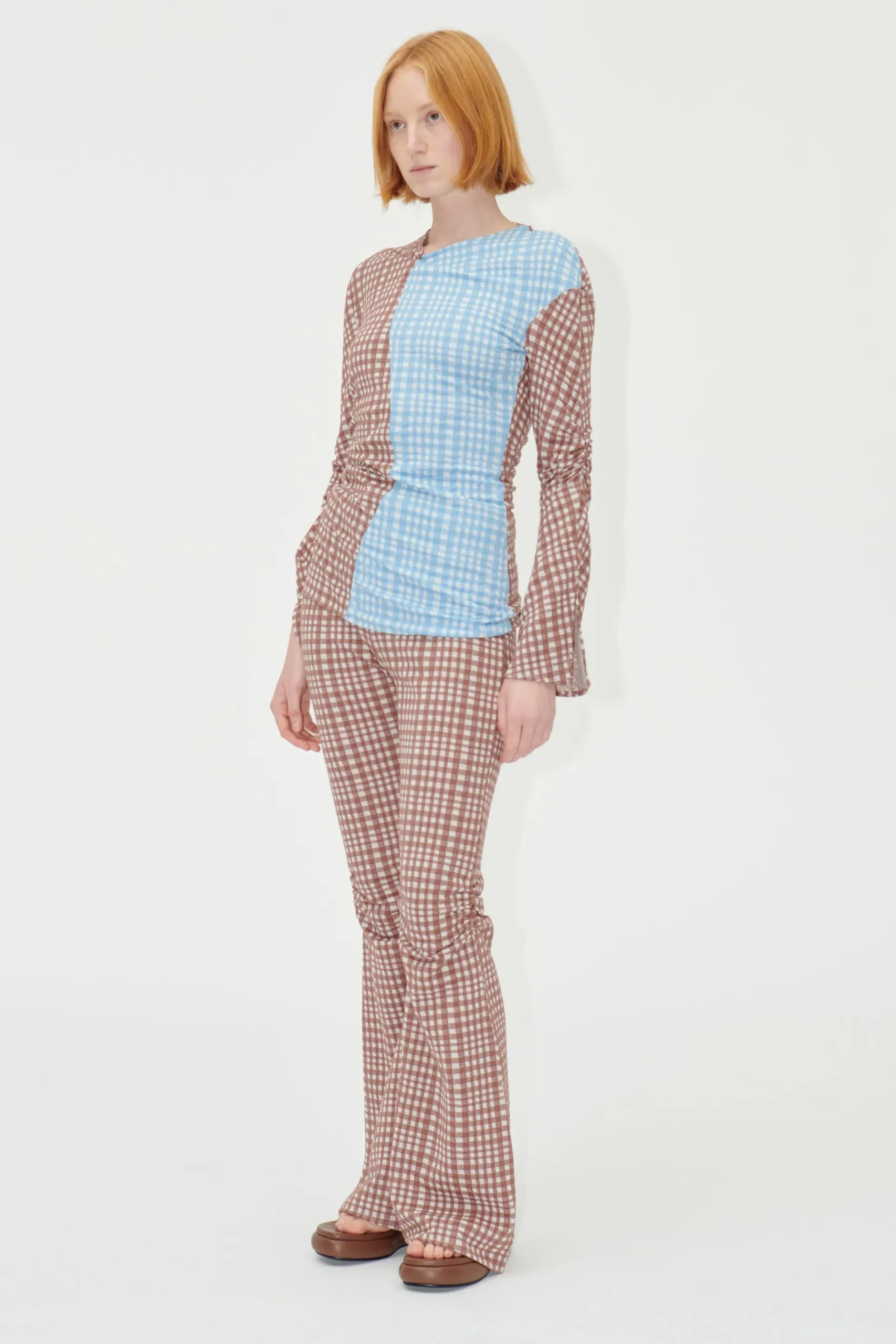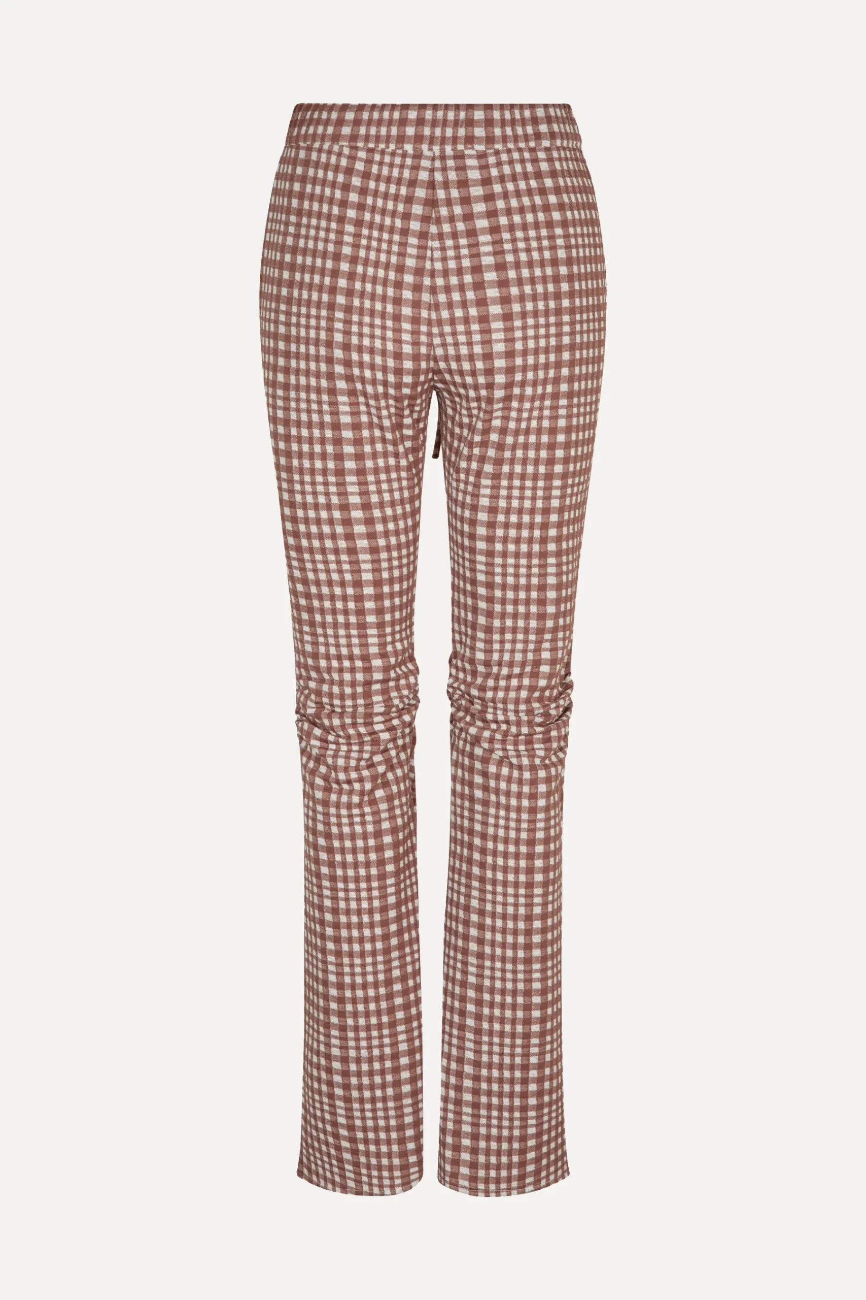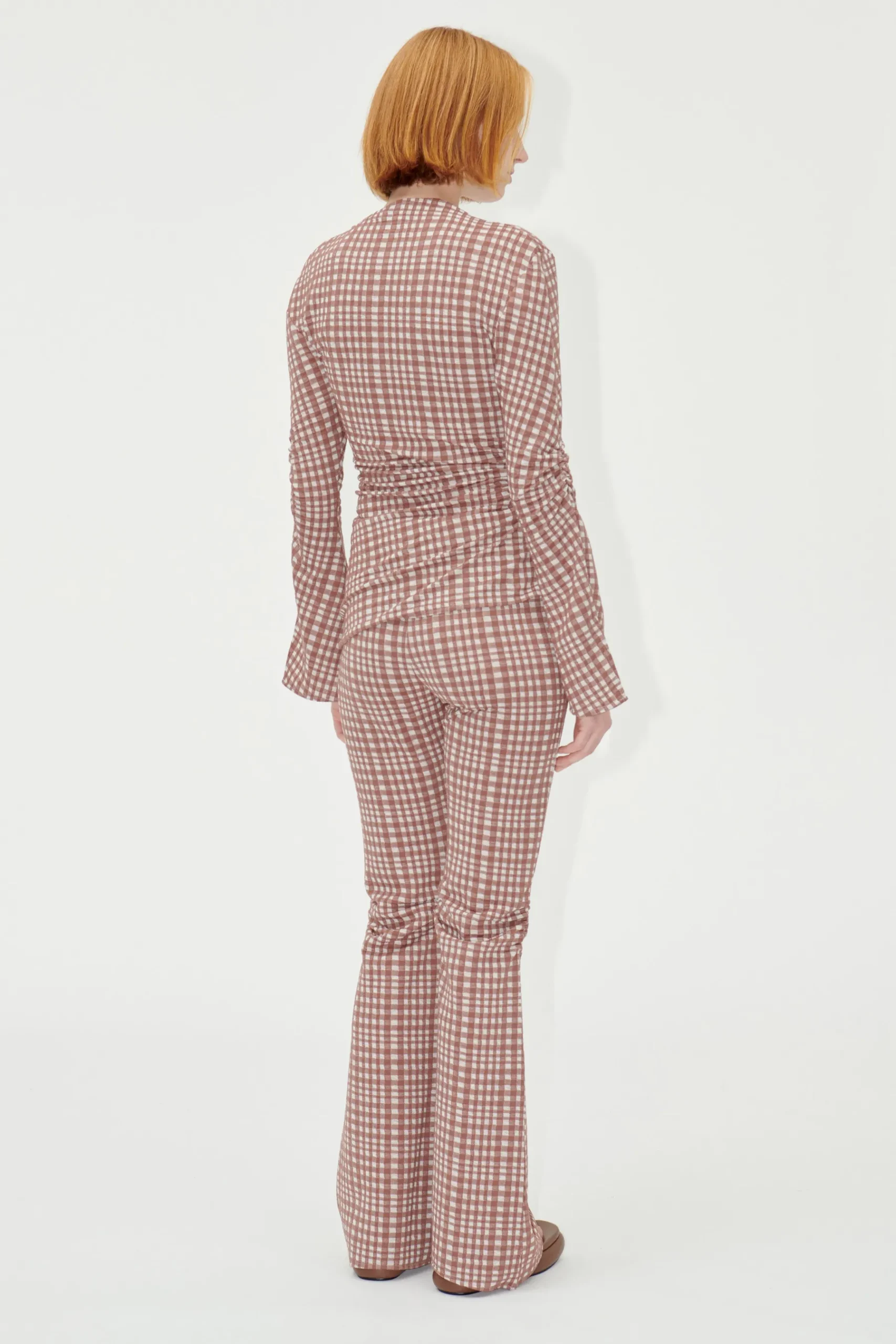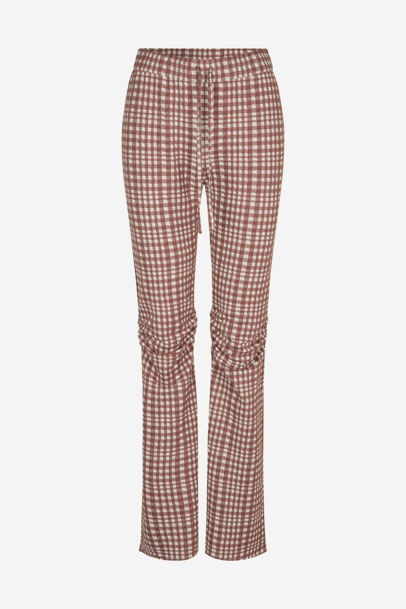 Slim fitting brown checkered pants with a slightly flared cut and high drawstring waist. Pair with the SGClementine Top in Brown Check and the SGSienna Sandals in Chocolate.