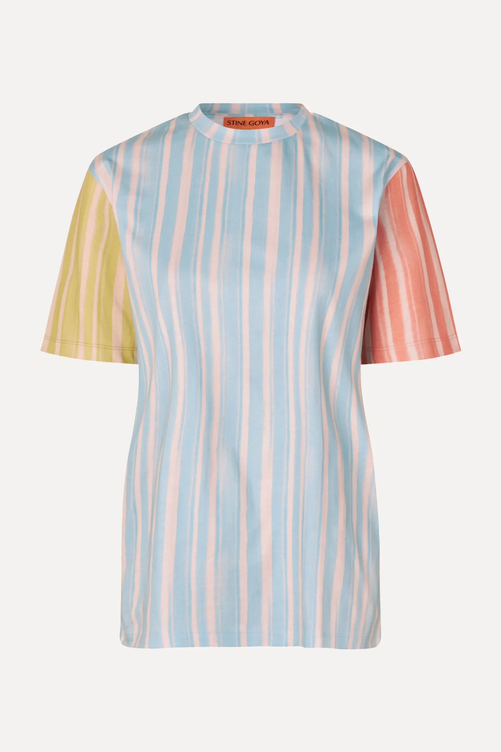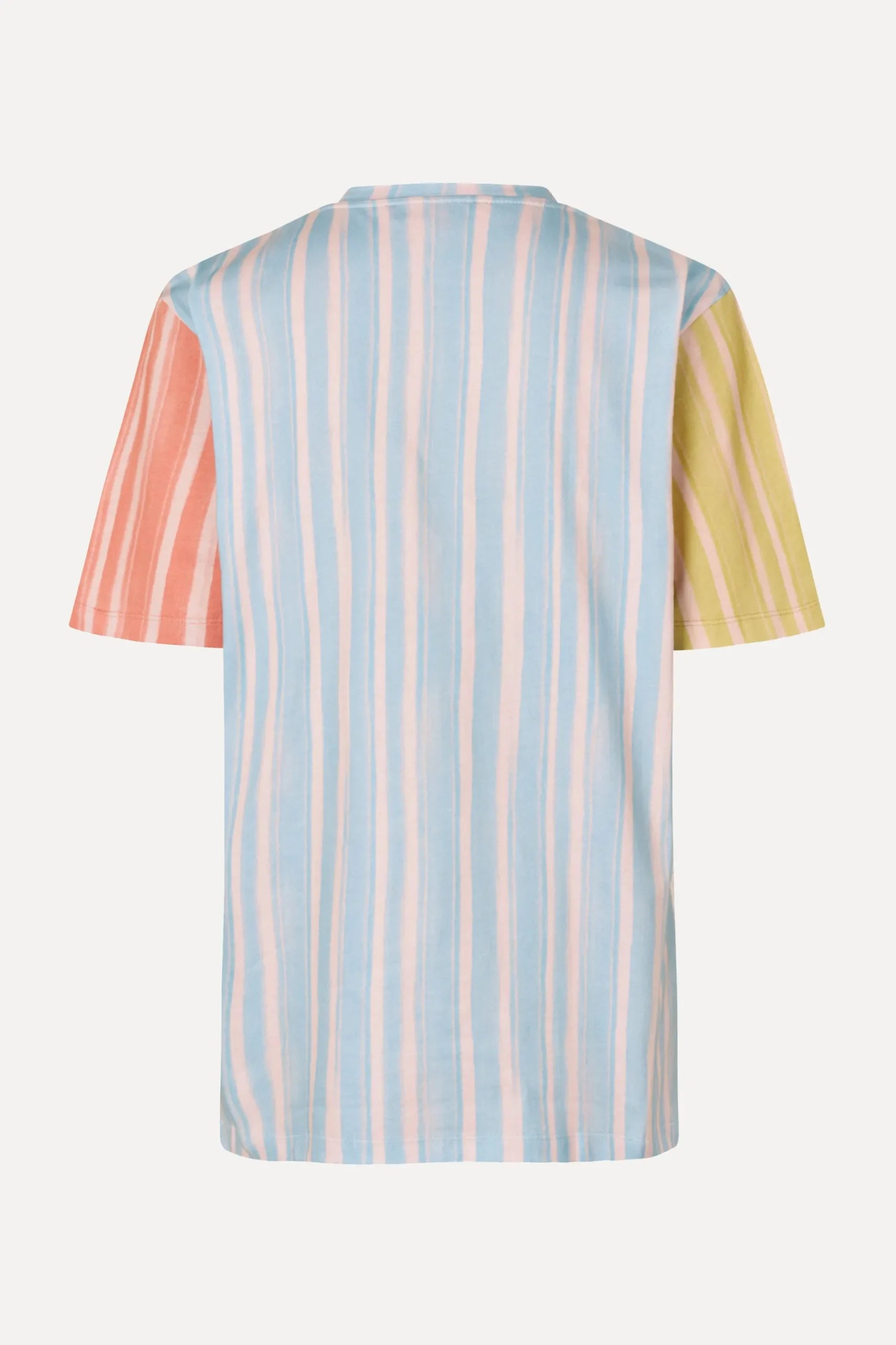Soft t-shirt with a relaxed hip length fit, boxy short sleeves and colourful mixed striped pattern. Pair with the SGEmi Pants in Summer Stripes.