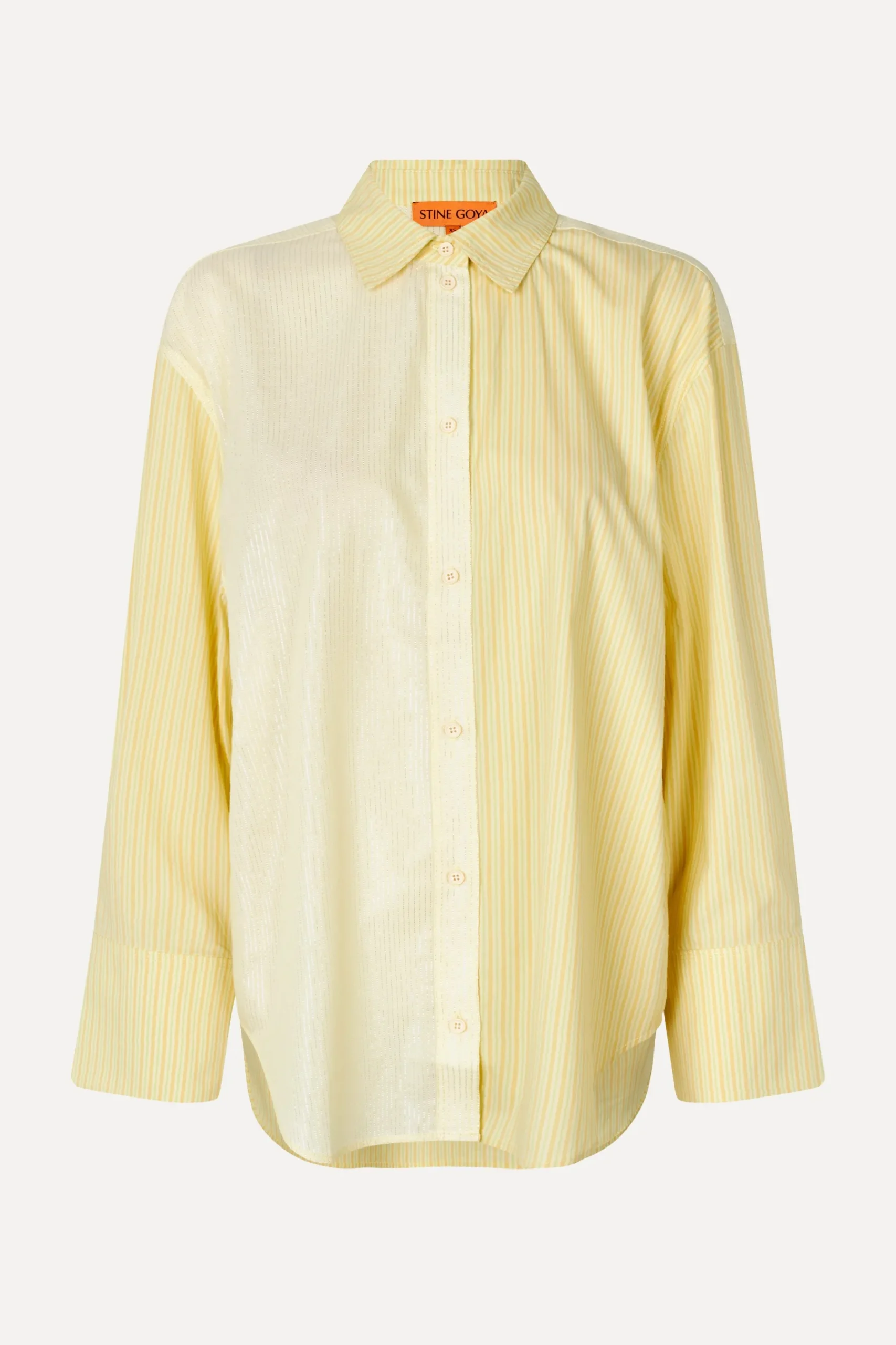 Casual button up blouse with a relaxed boxy fit, oversized buttoned cuffs and glittery colour blocked detail. Pair with the SGLeon Shorts in Lurex Stripes.