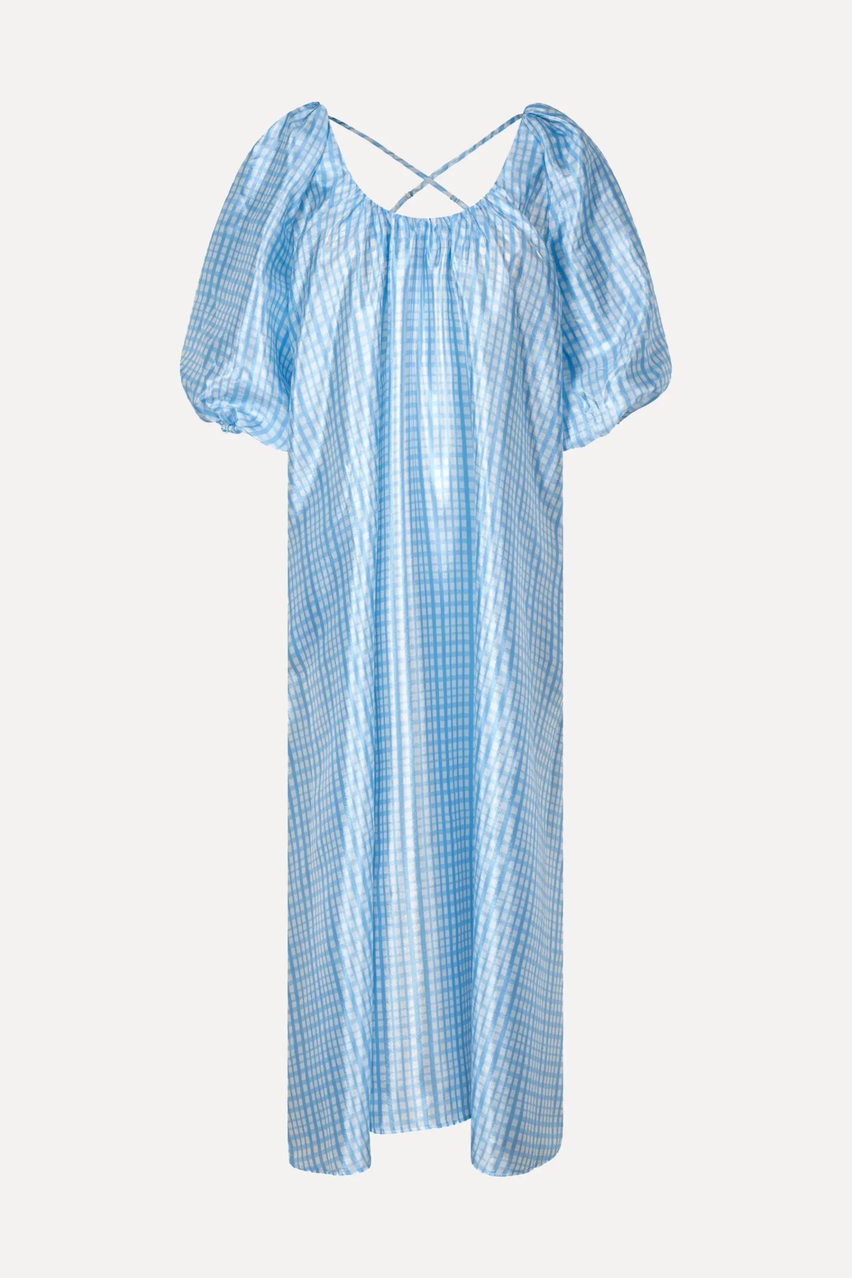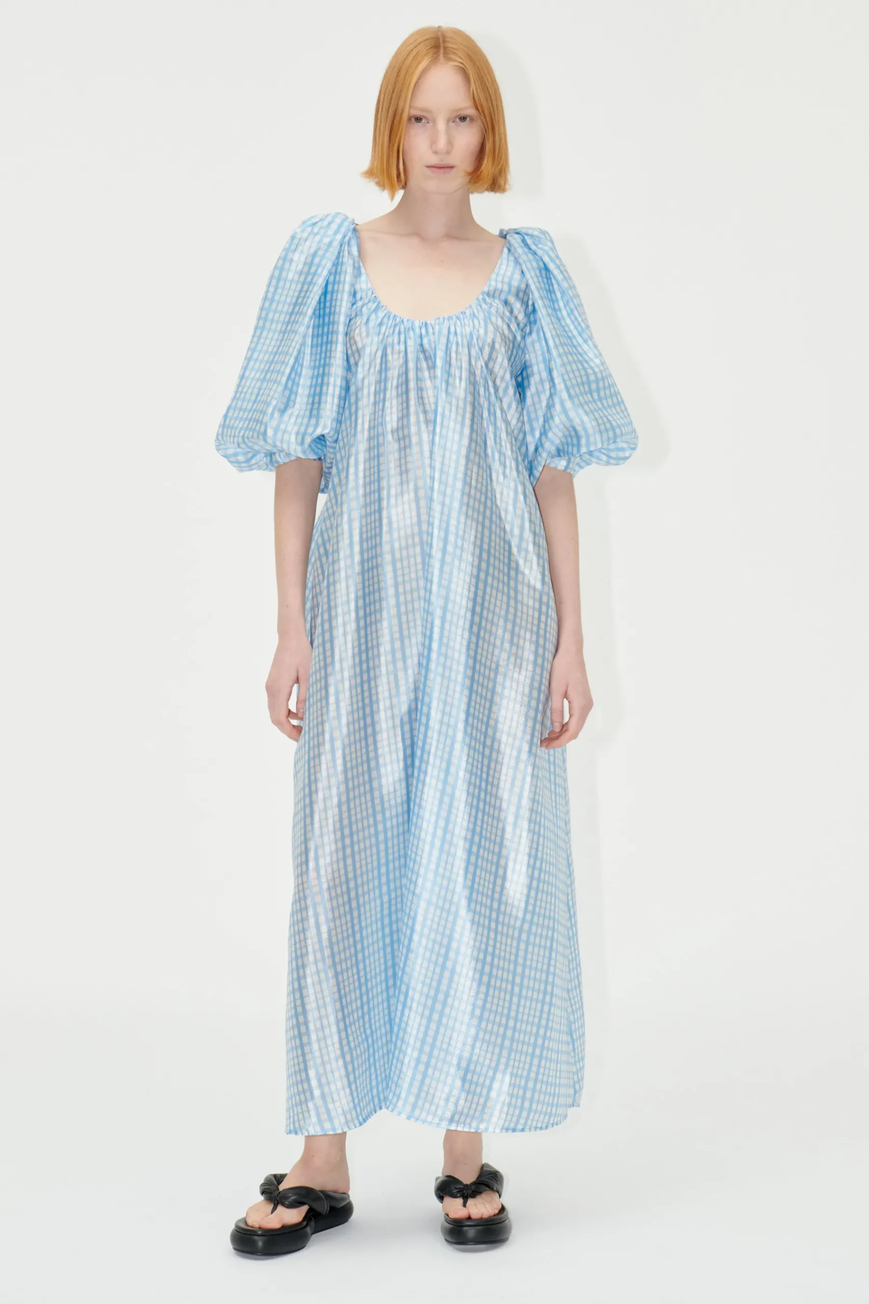 Flowy ankle length dress with front and back scoop neck, puffed mid-length sleeves and checked lustred material. Pair with the SGStockholm Clogs in Chocolate