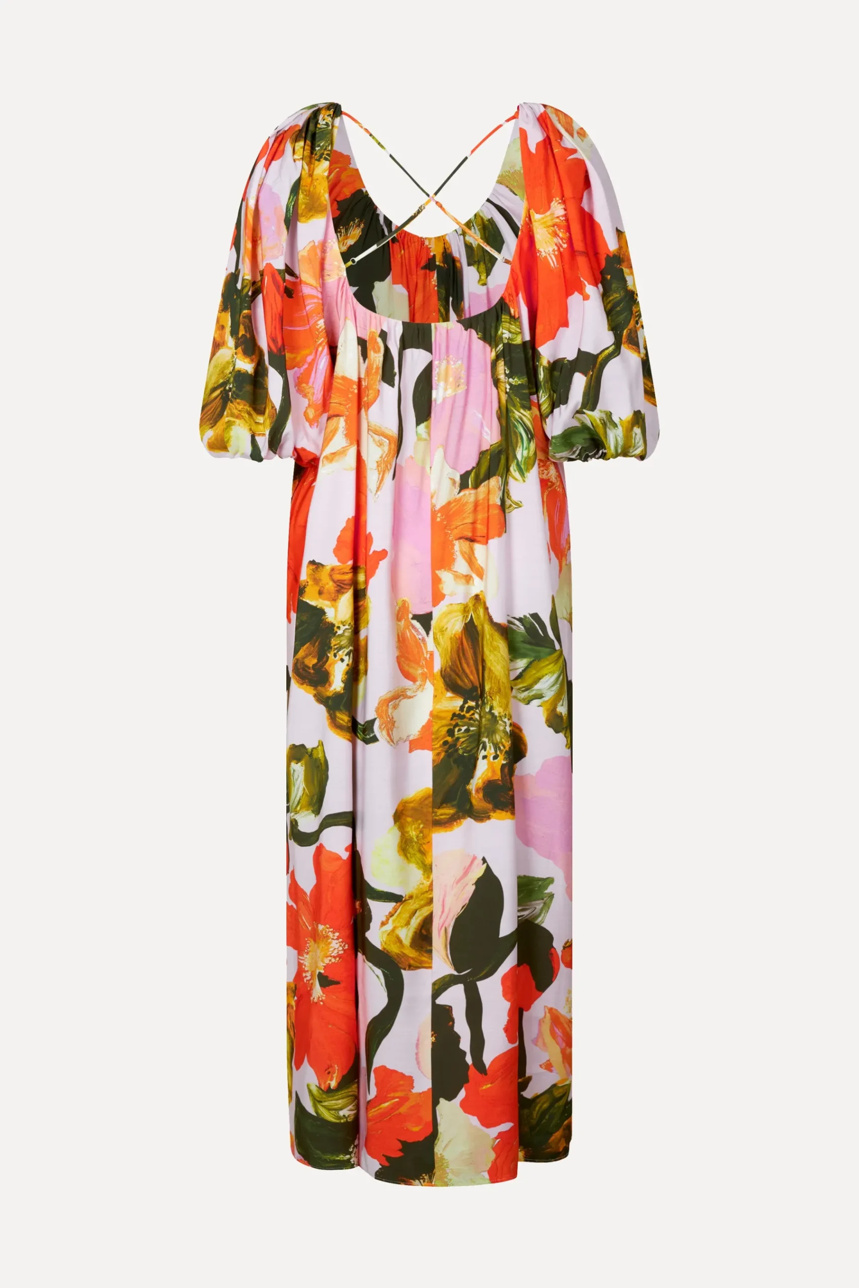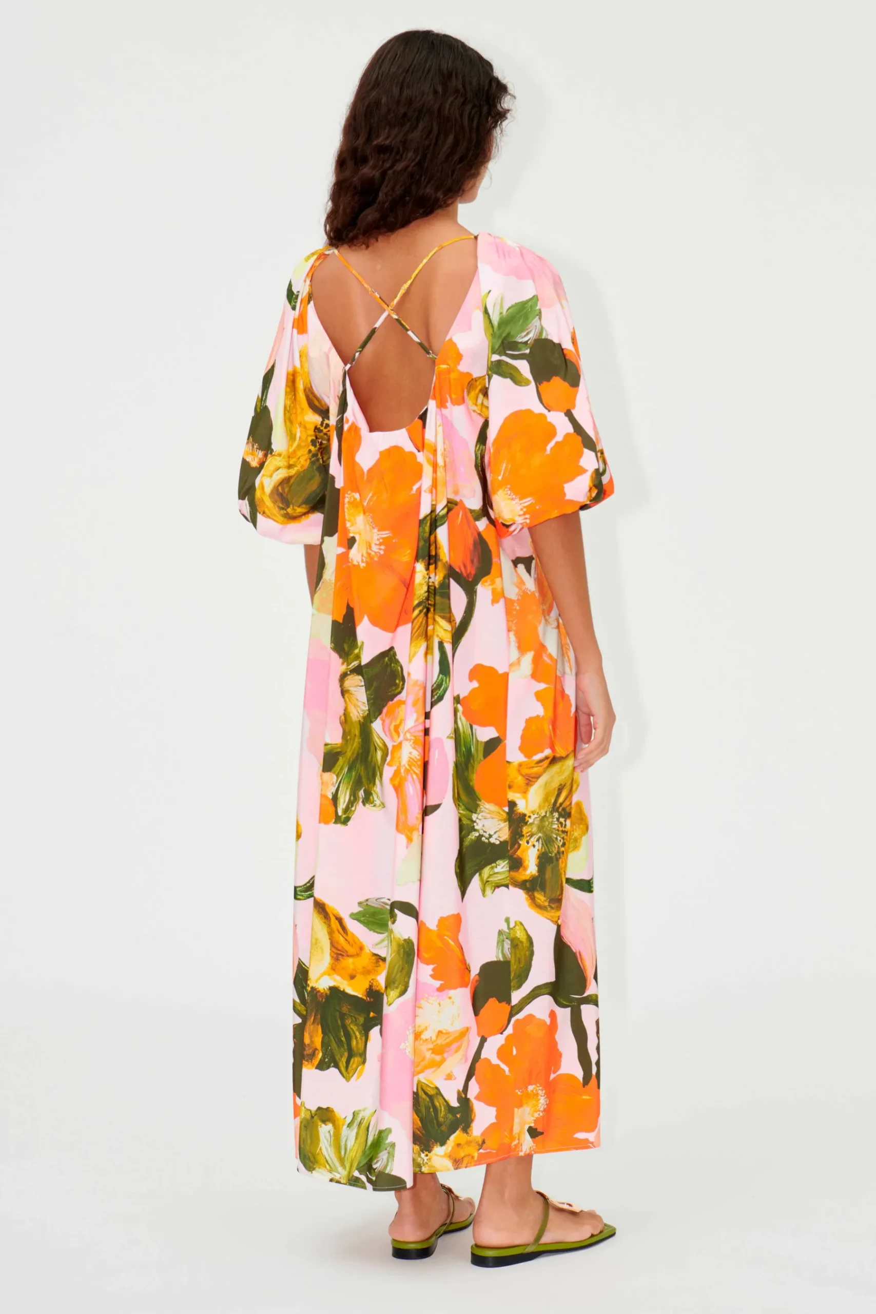 Floral dress with puffed elbow length sleeves, V-neckline and scoop back with thin adjustable straps. Pair with the SGCalabria Sandals in Olive.