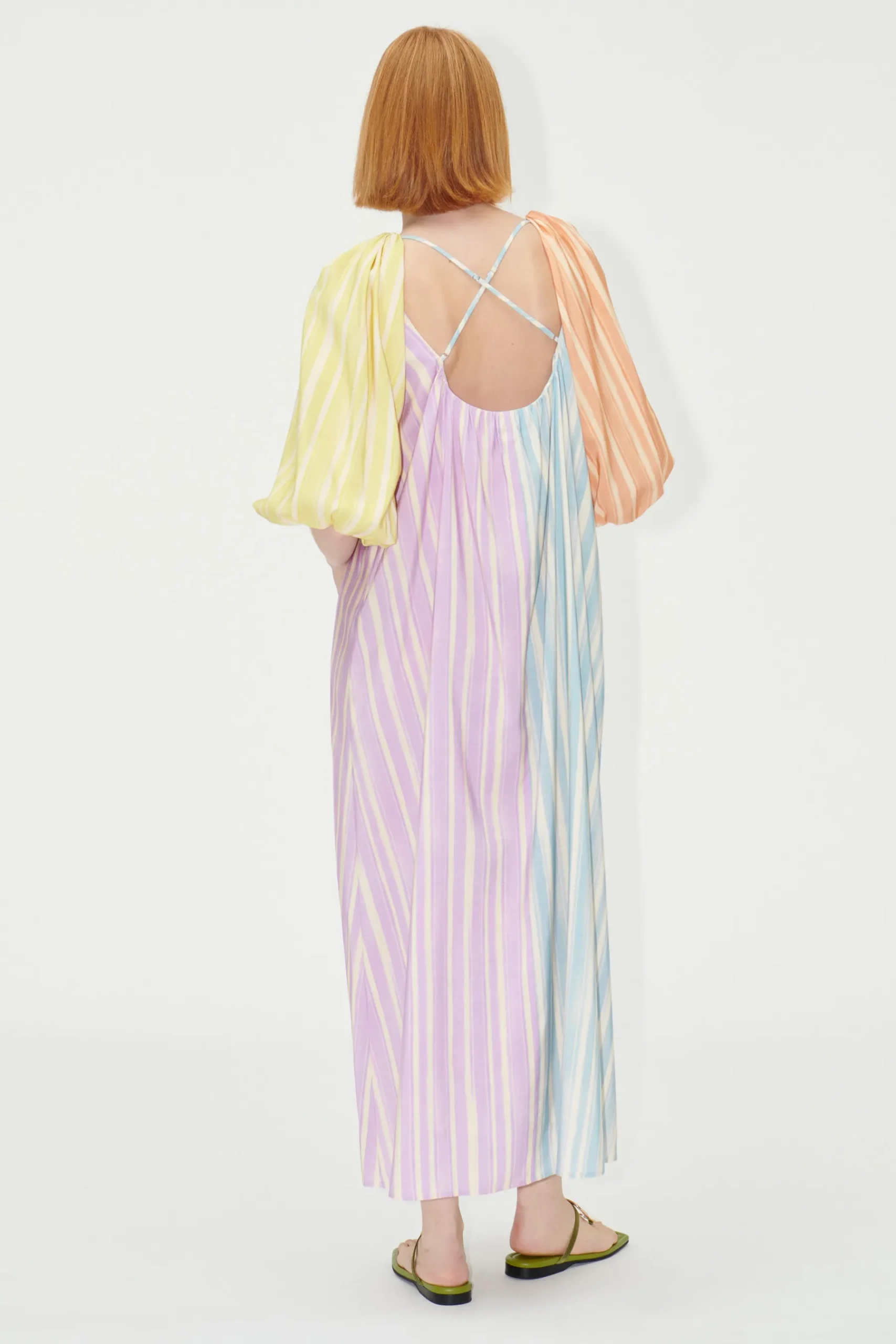 Flowy ankle length dress with voluminous sleeves, front and back scoop neck and colourful striped pattern. Pair with the SGCalabria Sandals in Olive.