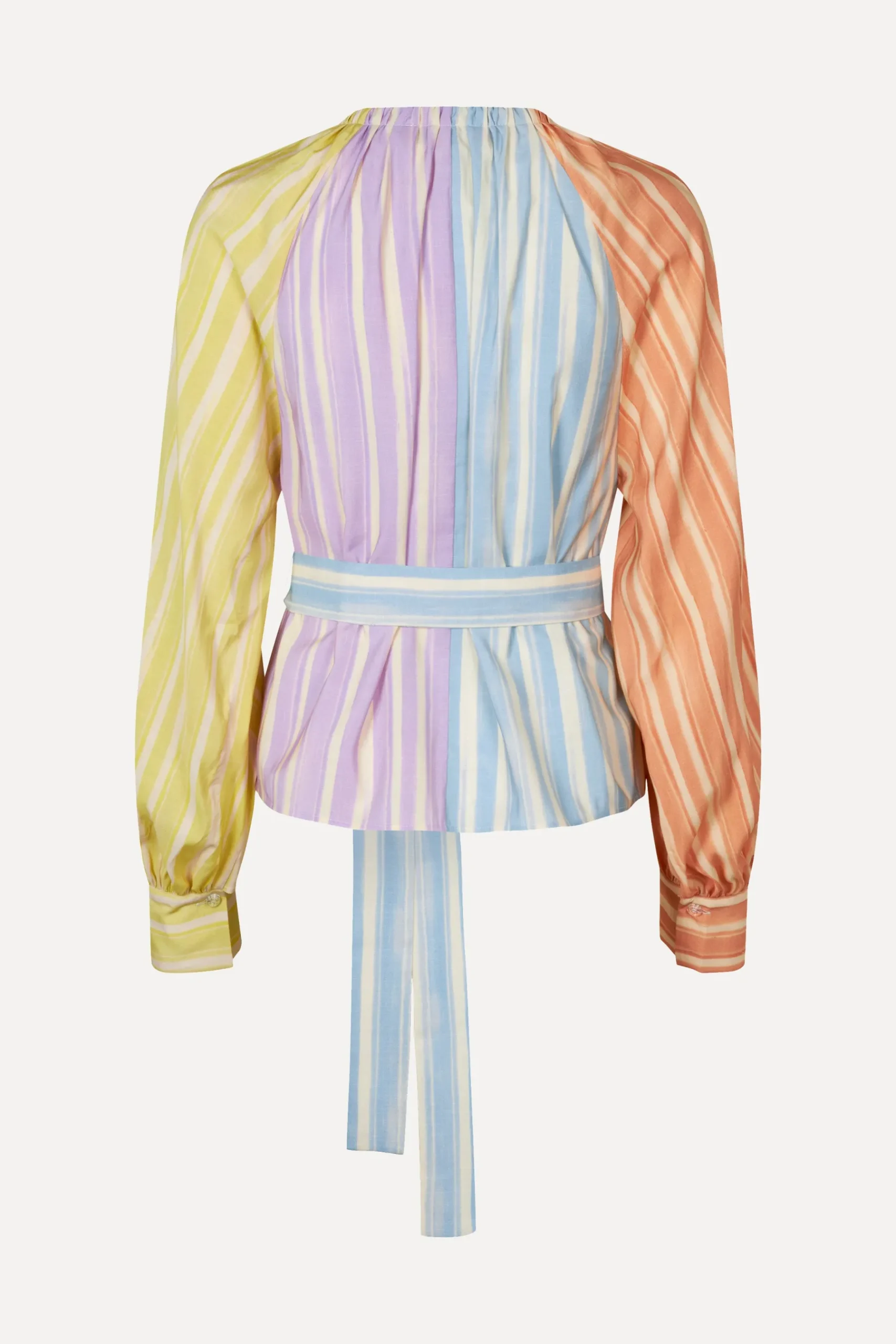 Colourful striped blouse with long cuffed sleeves, V-neck with tie detail and cinchable waist with tie belt. Pair with the SGEmi Pants in Summer Stripes.