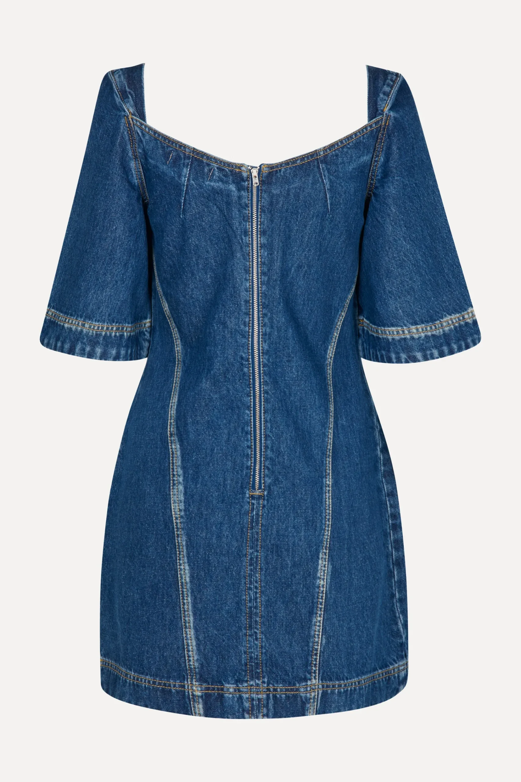 Structured denim mini dress with square neckline, elbow length sleeves and intricate angular seaming detail. Pair with the SGMonaco Heels in Chocolate.
