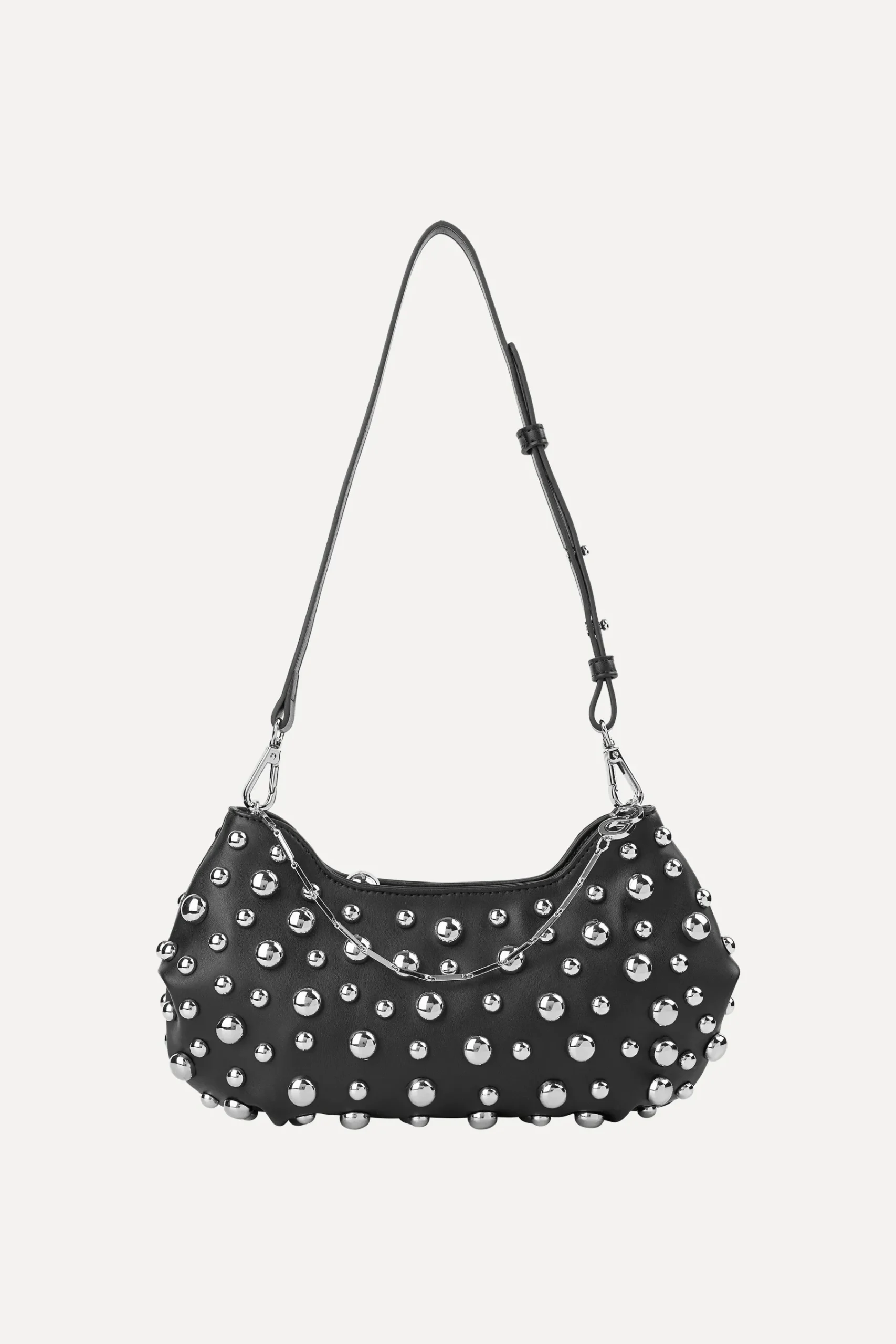 Slouched shoulder bag made from soft apple leather with rounded metallic studs, a removable strap, and a delicate top handle chain. Pair with your favorite look from the collection.