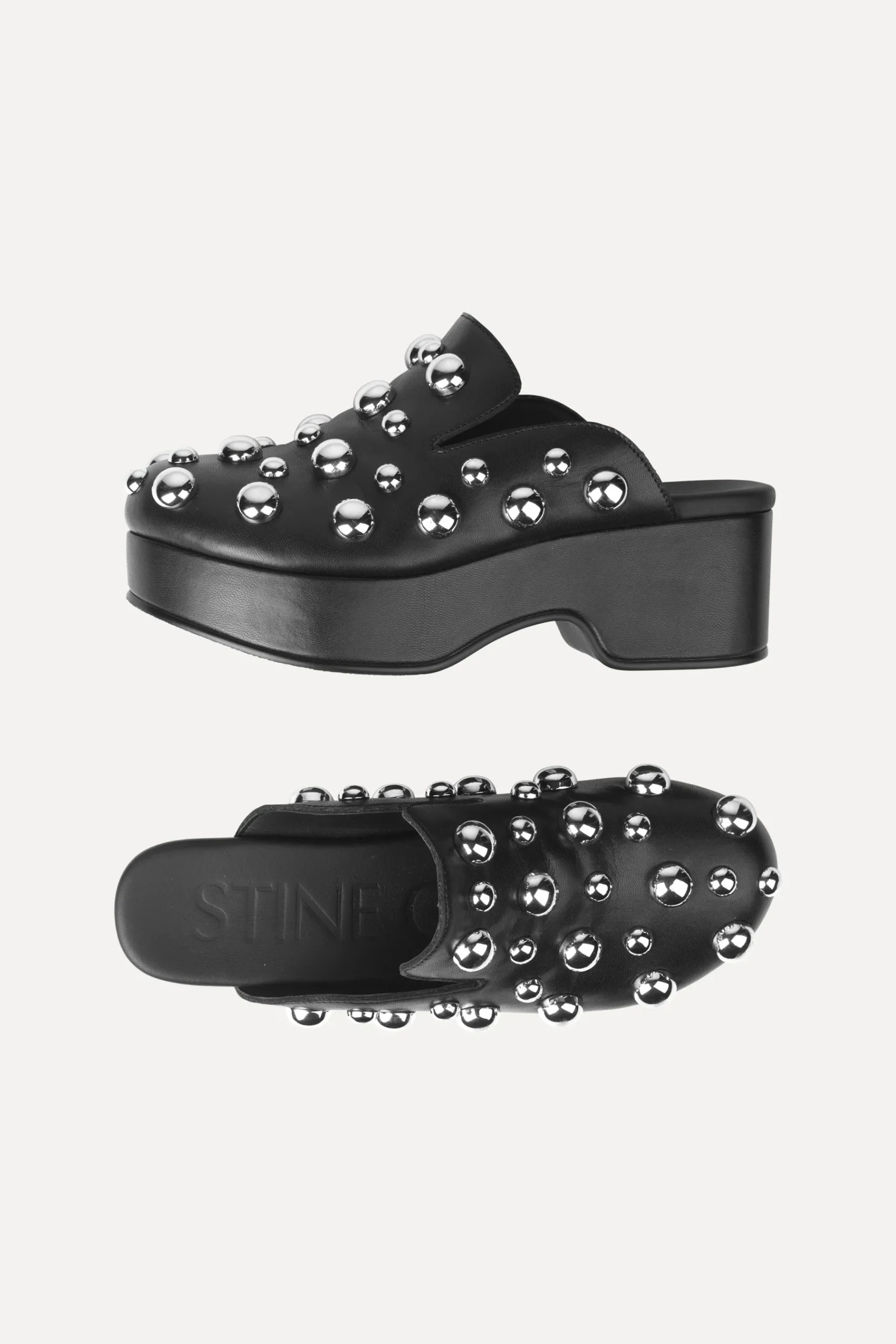 Edgy slip on platform clogs with comfortable block heel, soft durable material and rounded silver studs. Pair with your favourite look from the collection.