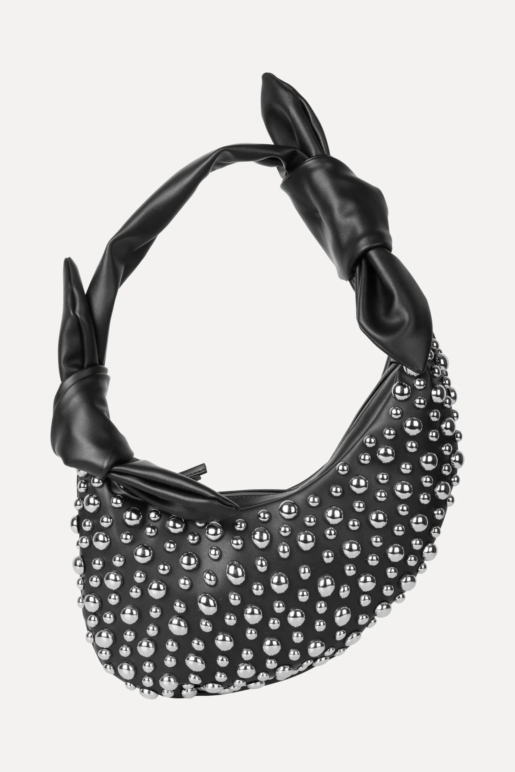 Modern slouched bag with knotted top handle and round metallic studs on luxurious leathery material. Pair with your favourite look from the collection.