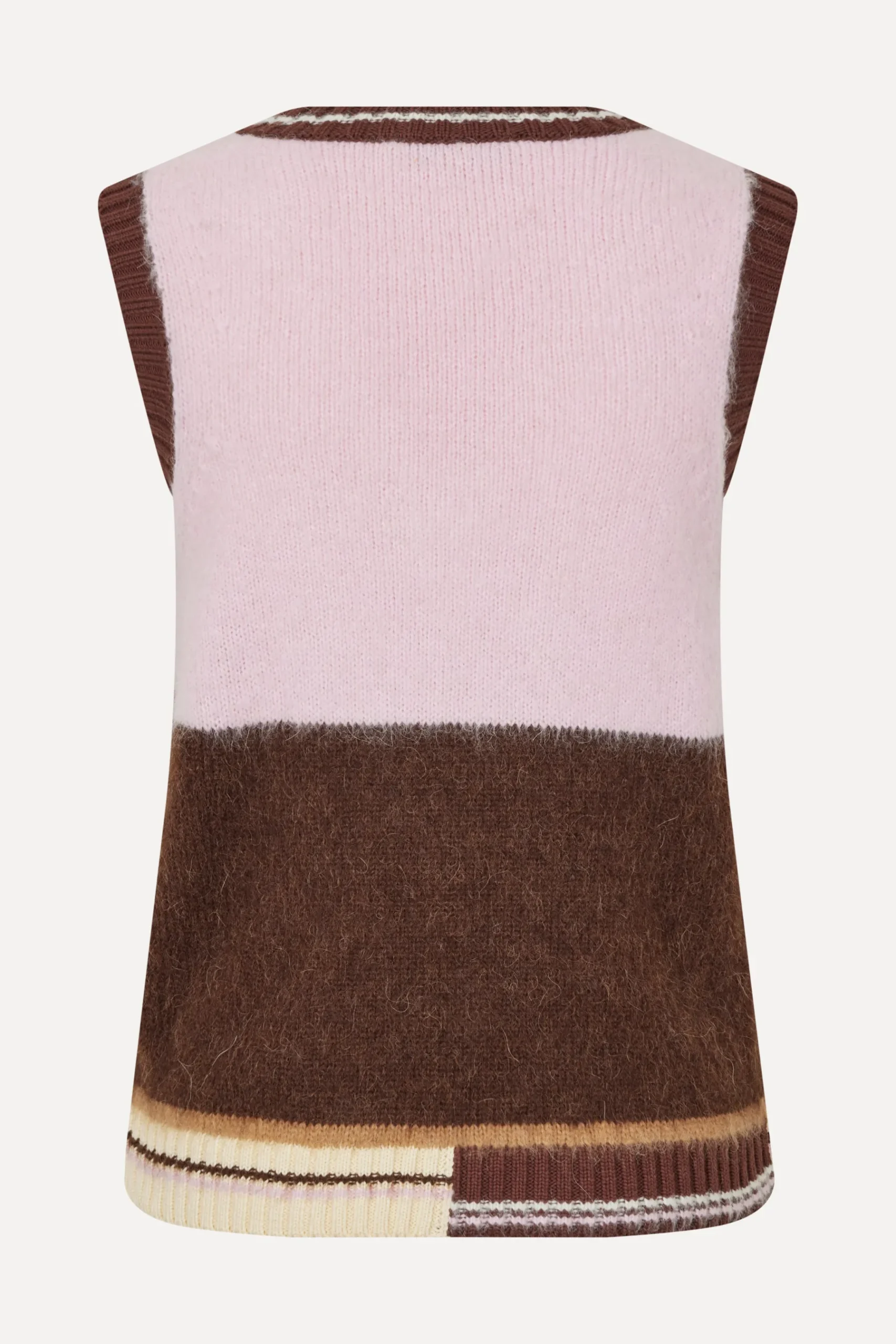 Soft and fluffy sleeveless knit vest with a relaxed fit, V-neck collar, and ribbed hem featuring striped details. Pair it with the Button Slit Detail Midi Skirt.