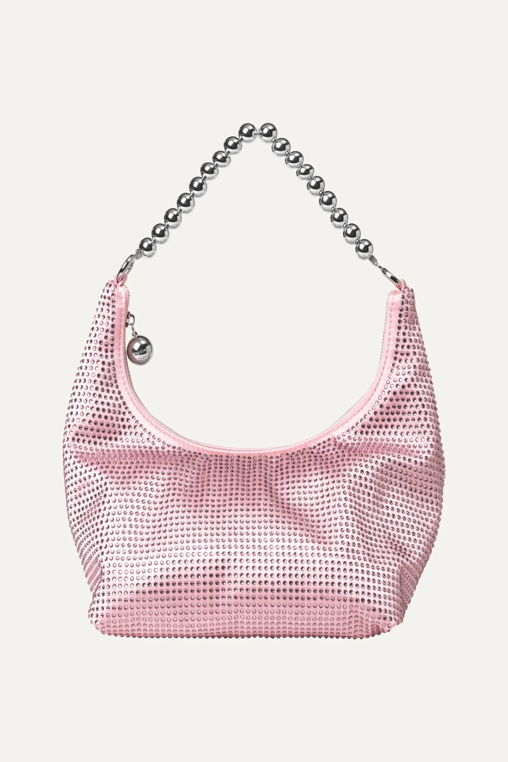 Modern slouched bag in pink with knotted top handle and round metallic studs on luxurious satin material. Pair with your favourite look from the collection.
