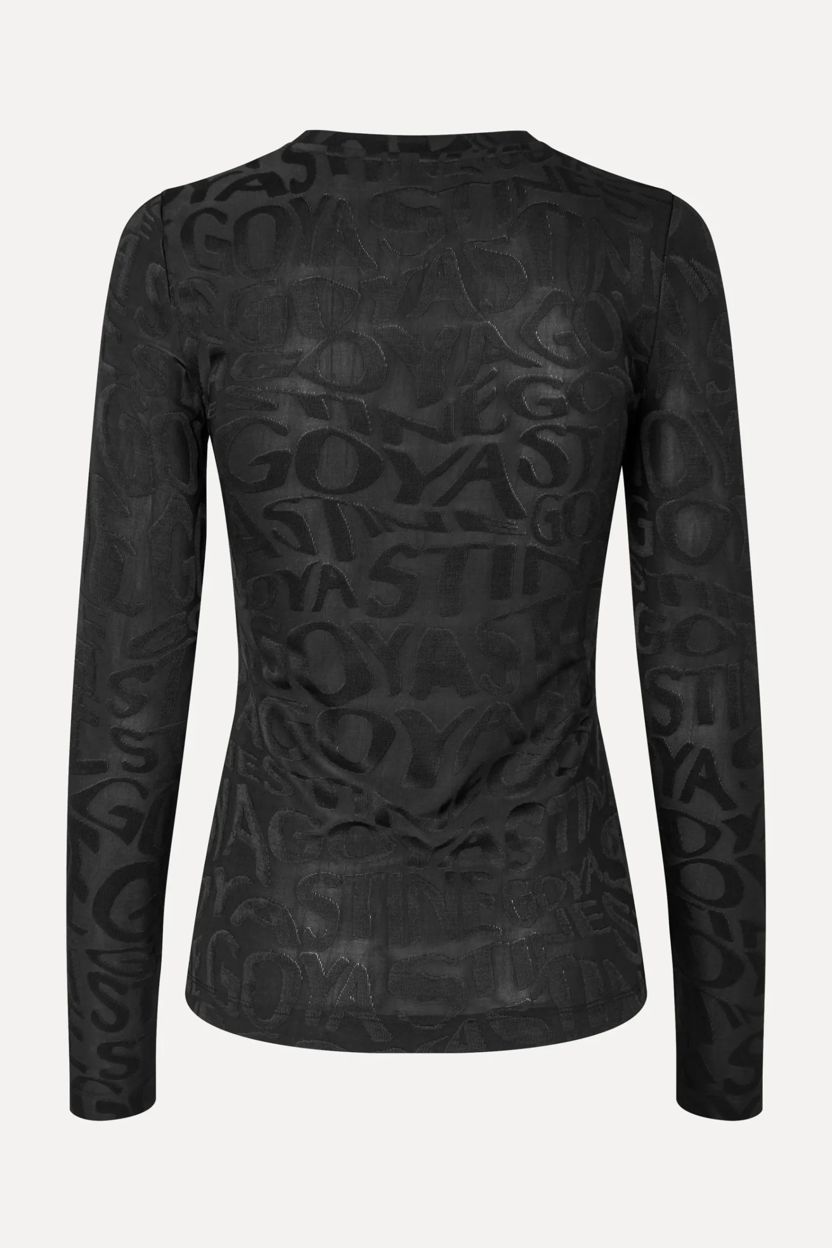 Slim fit, stretchy top with crewneck and long sleeves in lightweight, sheer fabric featuring a burnout Stine Goya logo in monochrome Black.