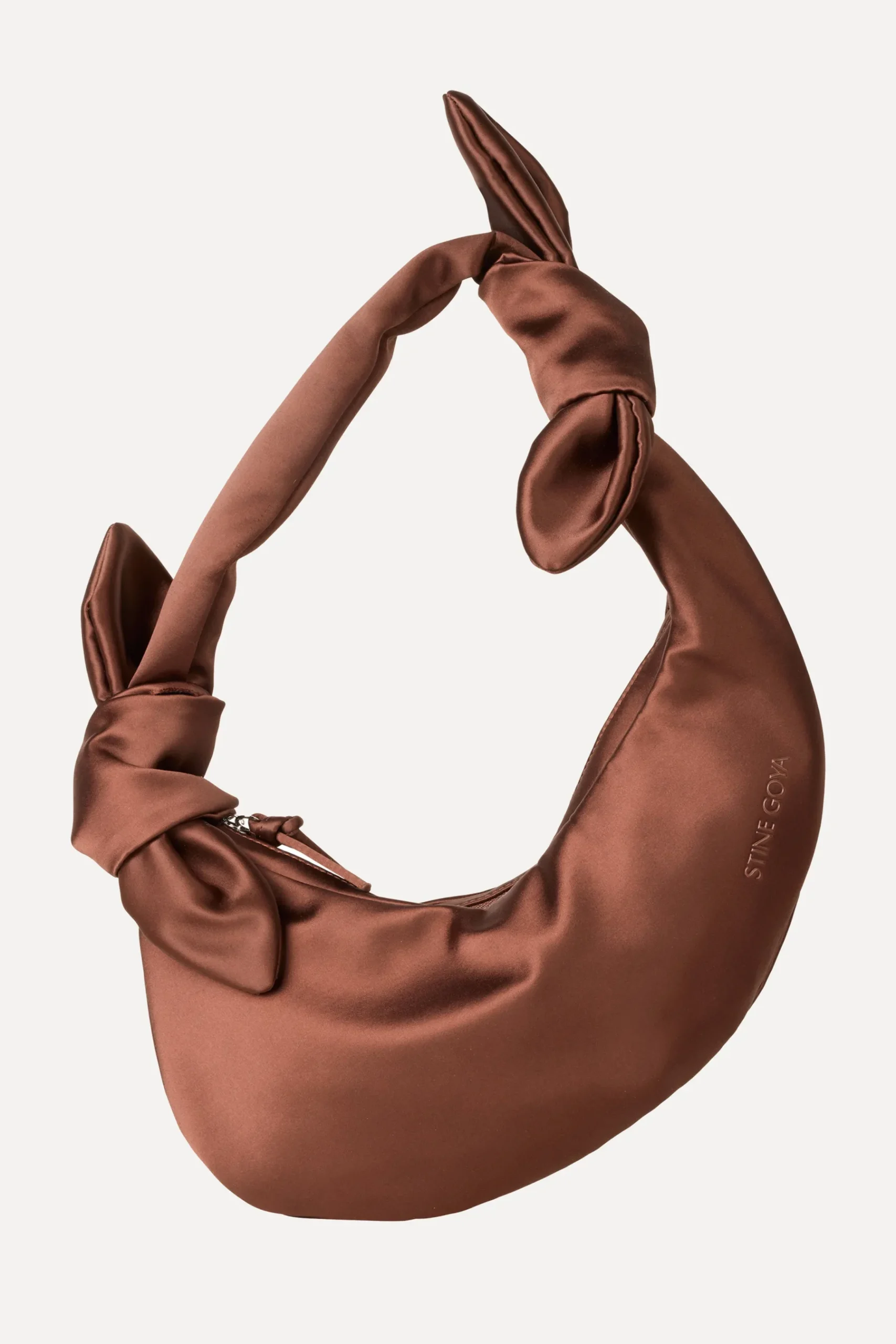 Slouched hobo style bag with knotted top handle, zippered main pocket and sheened satin material. Pair with your favourite look from the collection.
