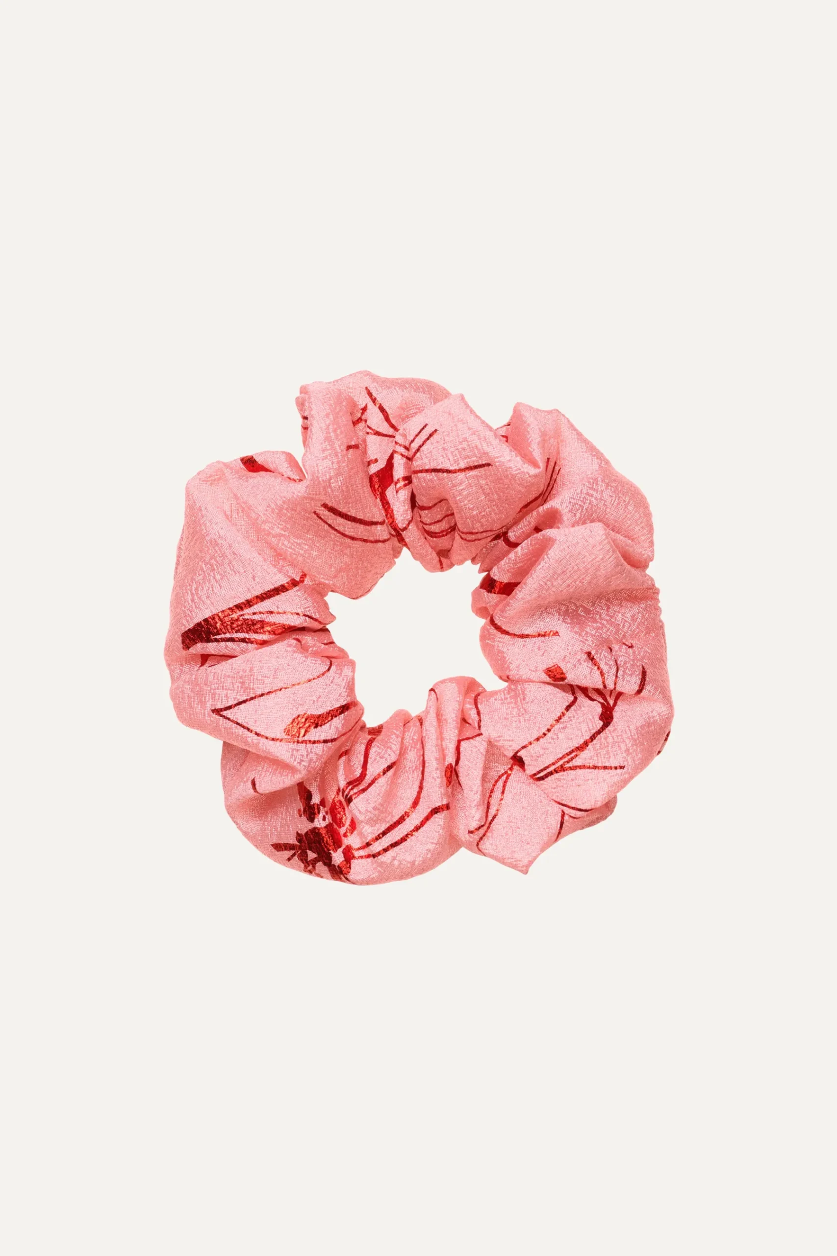 Delicate and voluminous scrunchie with sheened textured material surrounding a comfortable elastic band.