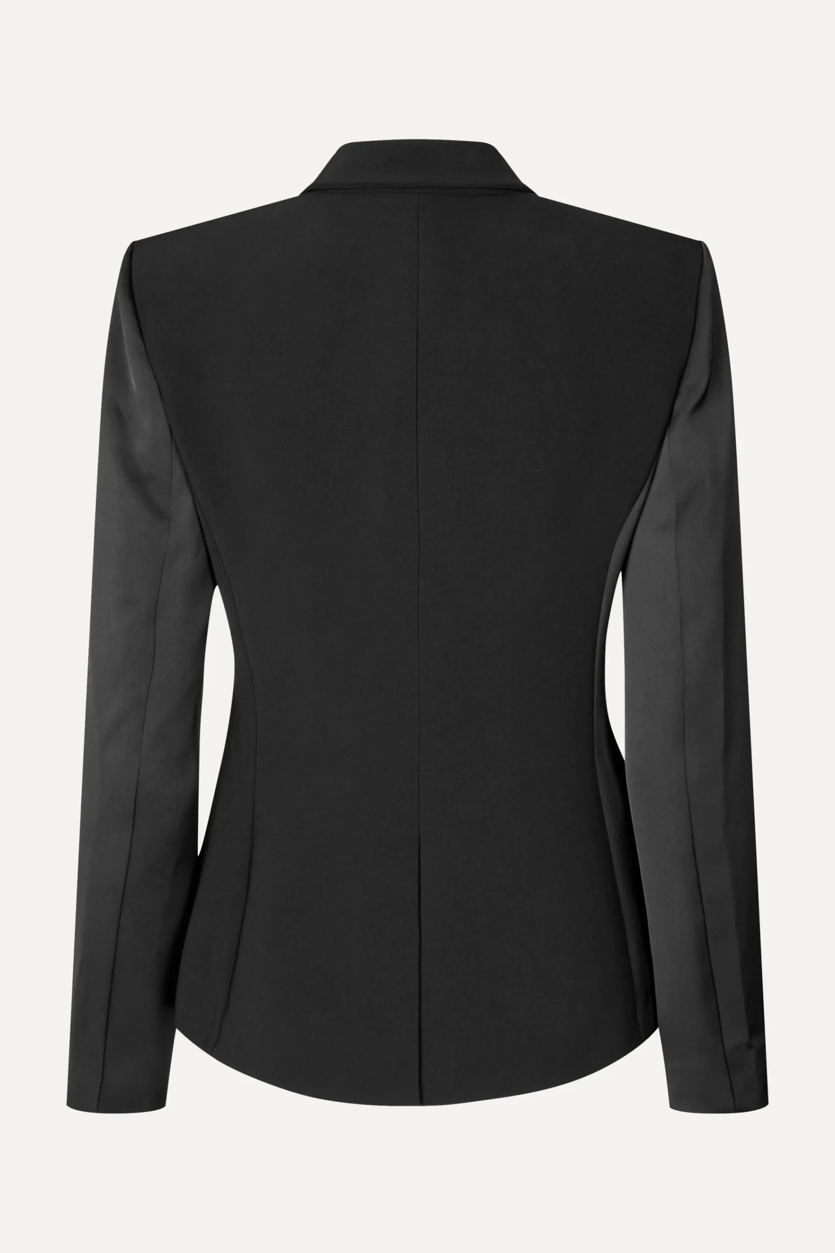 Structured single breasted blazer with asymmetrical hem, slim high waist and satin lapel and sleeve detail. Fully lined. Pair with the SGAsha Pants in Jet Black.