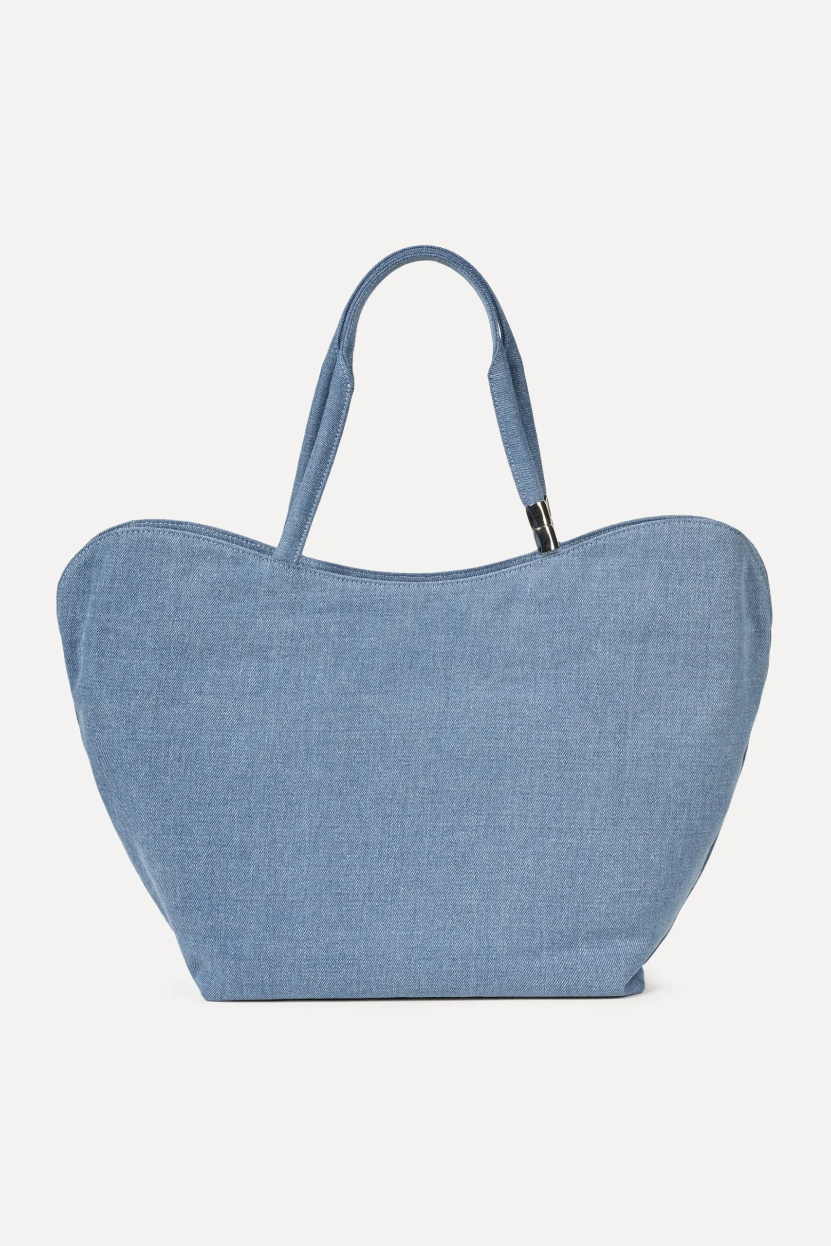 Spacious slouched tote bag with 2 comfortable shoulder straps, zip closure on main pocket and soft denim material.