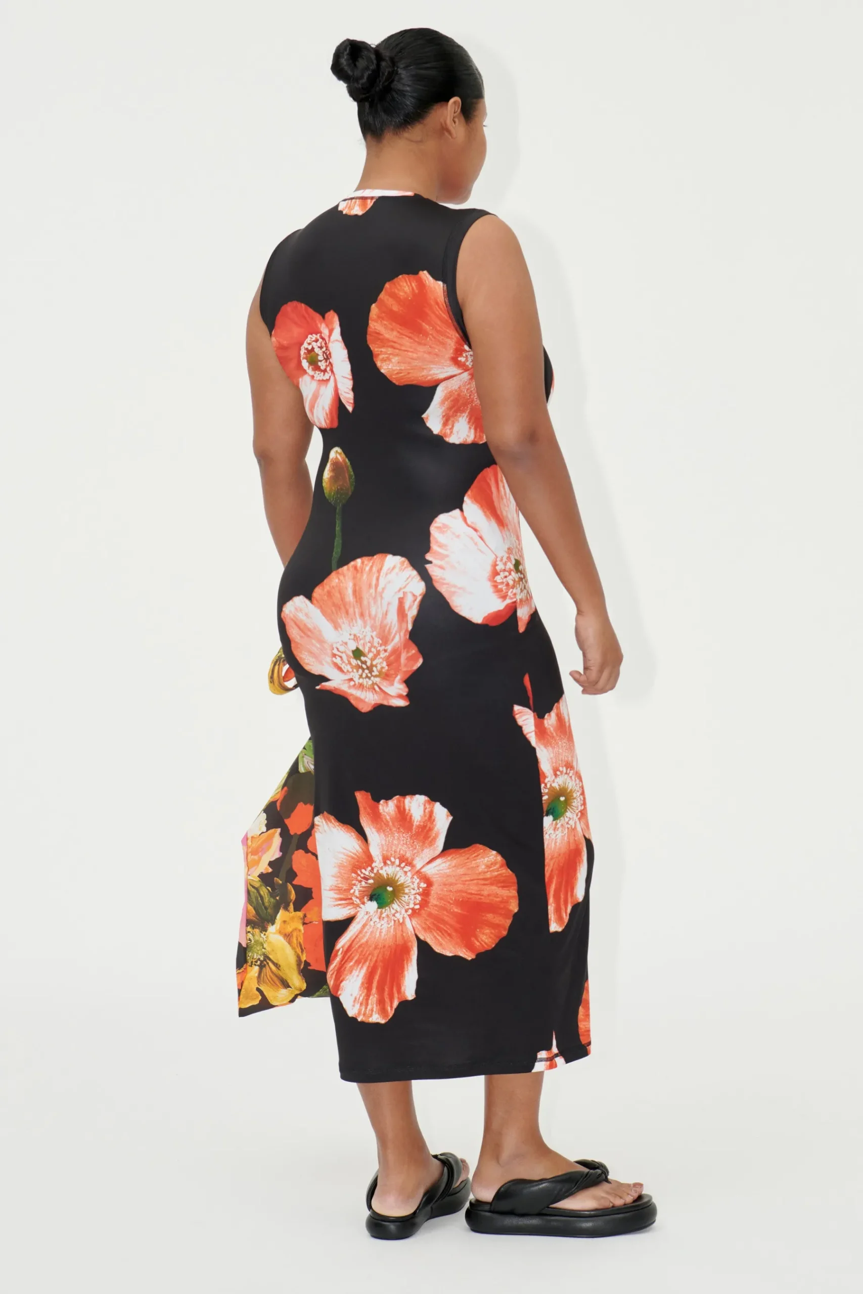 Sleeveless mid-length dress with a fitted silhouette and bright pattern with poppies on soft stretchy material. Pair with your favourite accessories from the collection.