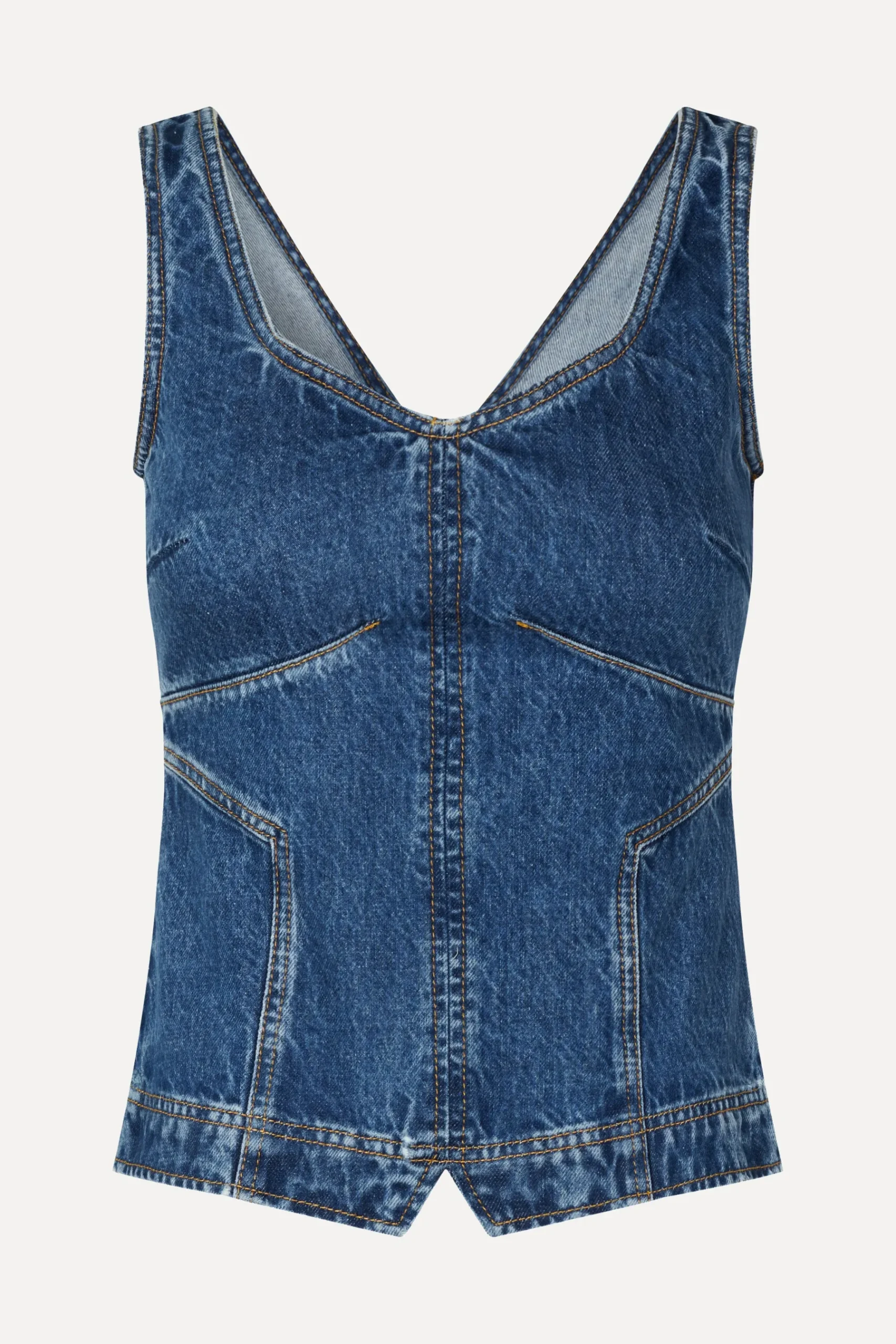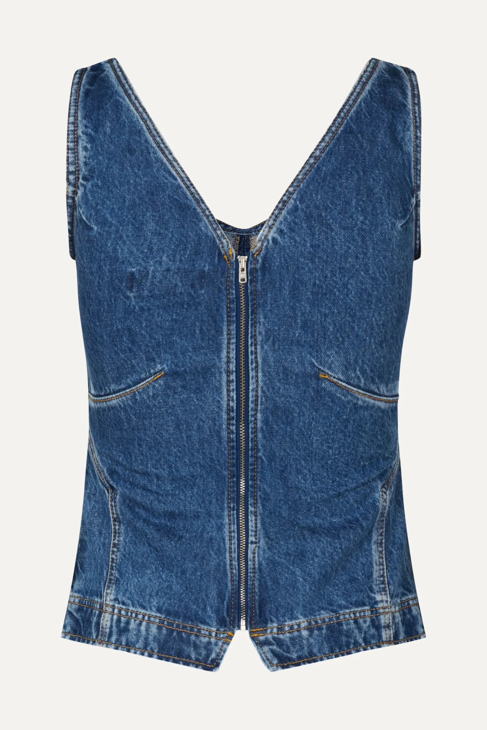Structured sleeveless denim top with a fitted silhouette, front and back V-neckline and zip closure on the back. Pair with the SGDion Pants in Trompe L’oeil.
