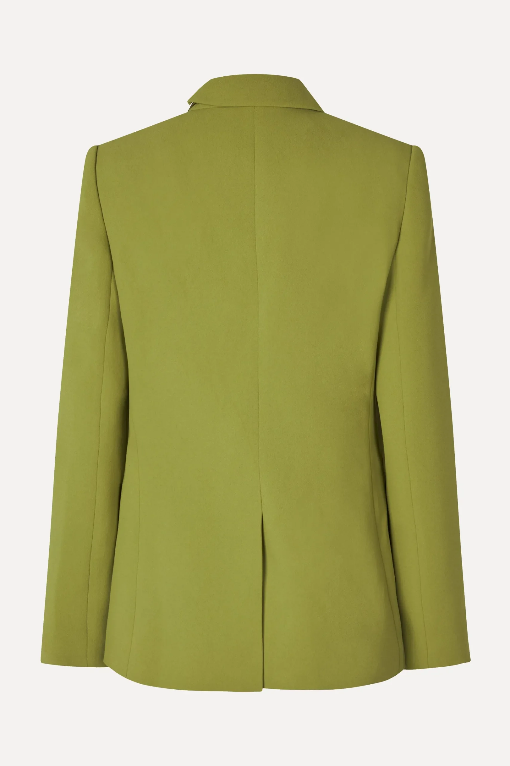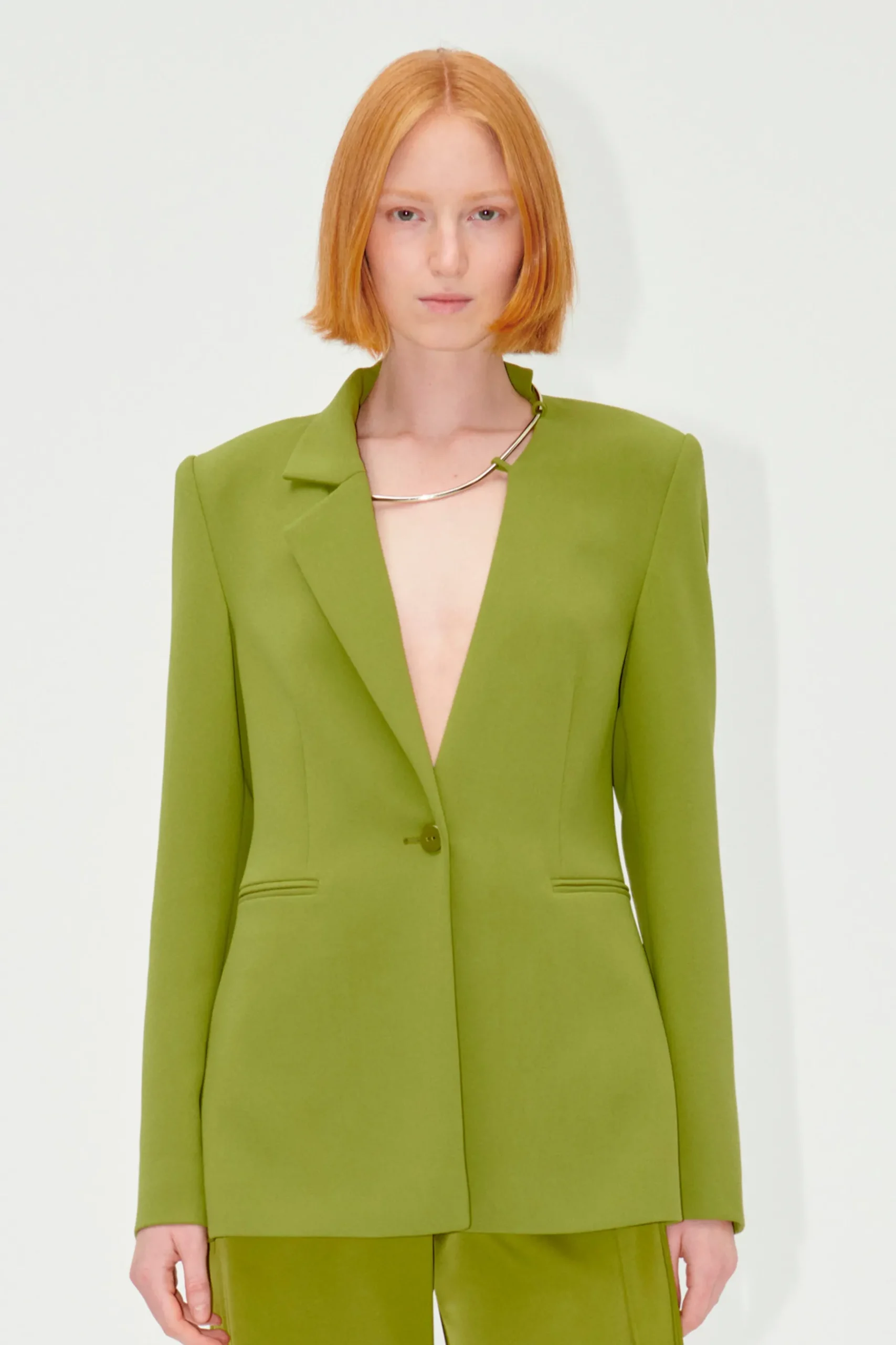 Elegant single breasted blazer with long hem, boxy silhouette and asymmetrical collar with gold necklace detail. Fully lined. Pair with the SGGracie Pants in Olive.