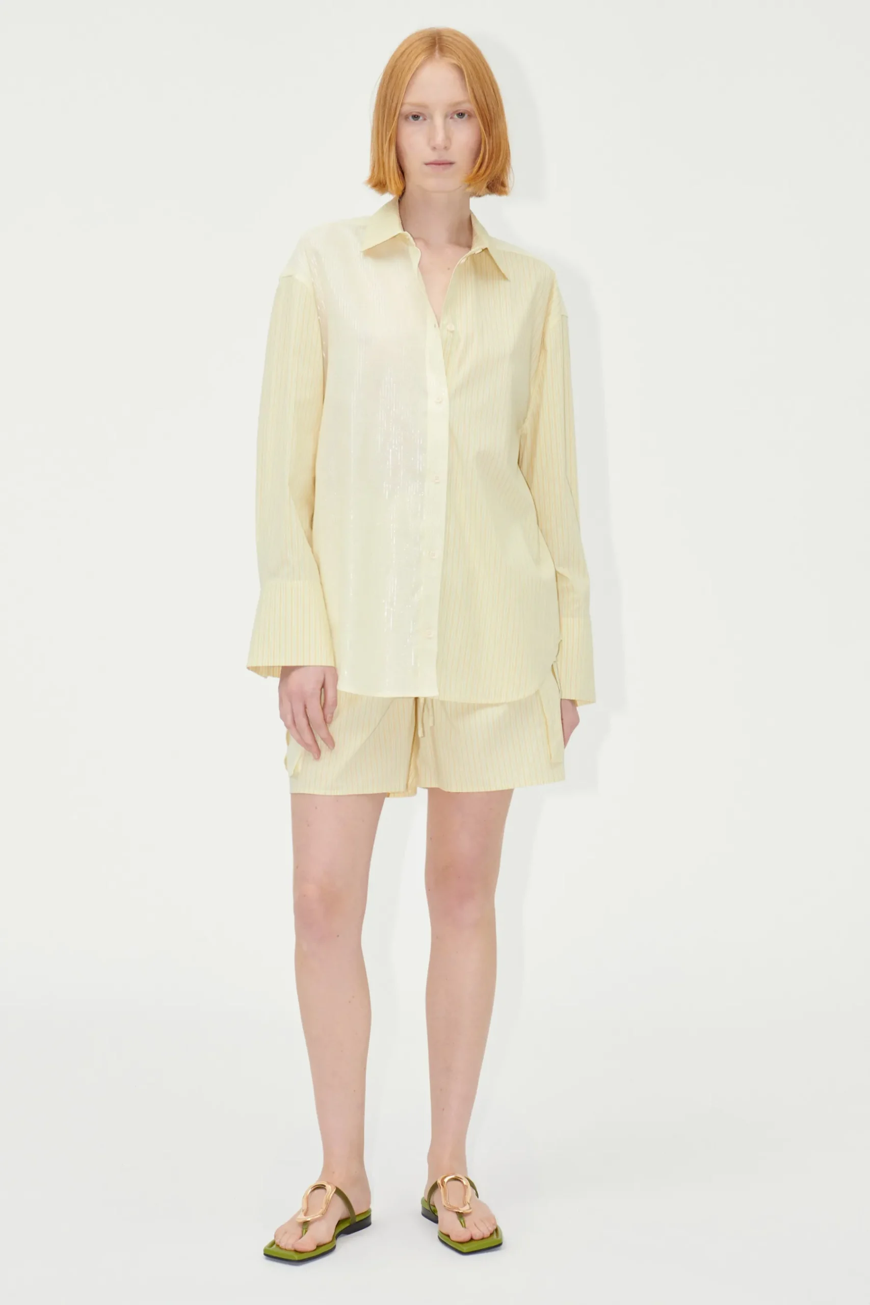 Striped mid-thigh length shorts with patch pockets, high elasticated waist with drawstring and relaxed fit. Pair with the SGMia Shirt in Lurex Stripes and the SGCalabria Sandals in Olive.
