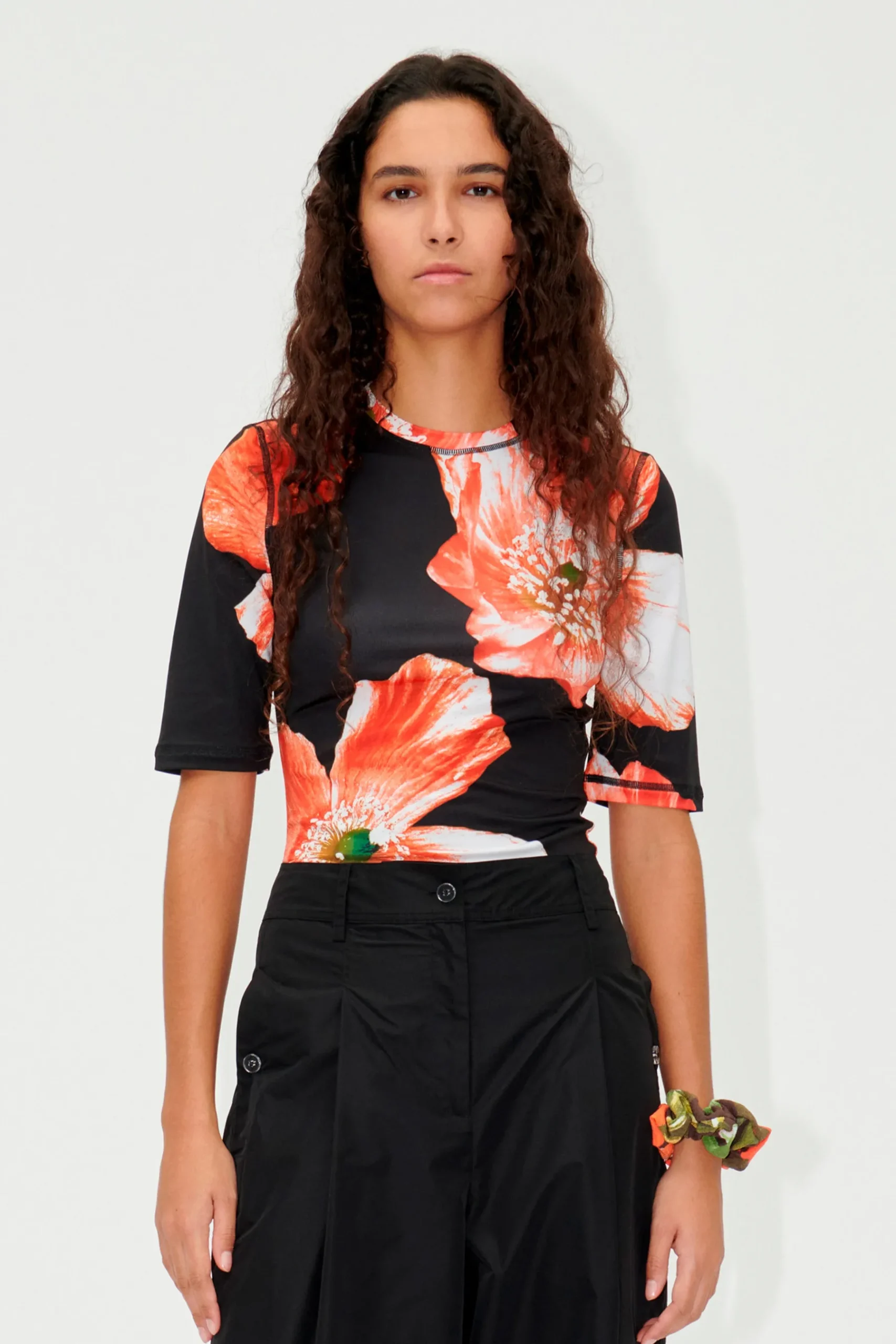 Short sleeve top with fitted hip length silhouette, crewneck and intricate floral pattern on stretchy material. Pair with the SGChrissy Pants in Jet Black.