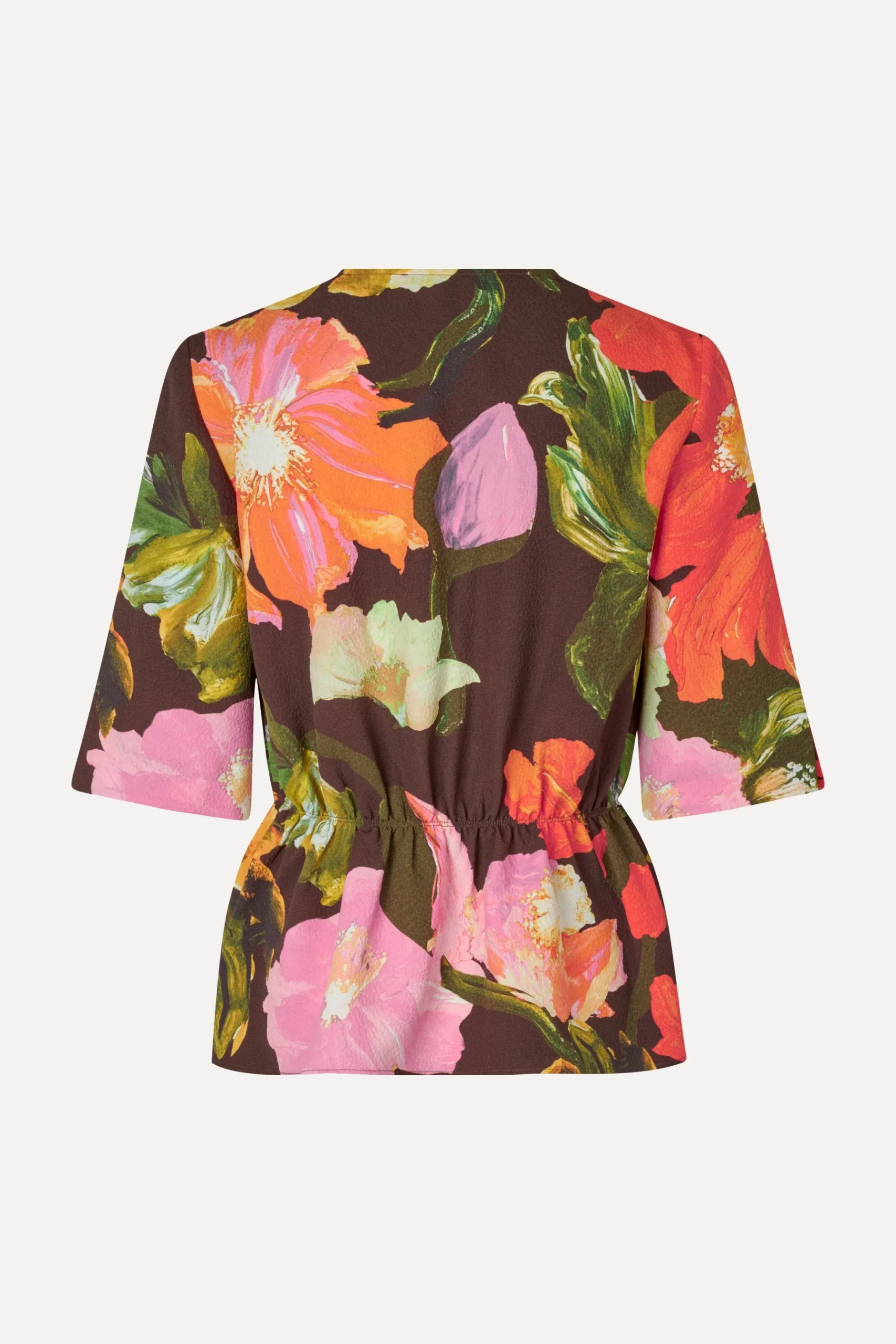 Peplum top with a deep V-neckline, short boxy sleeves and elasticated peplum waist. Bright floral pattern. Pair with the SGFatou Pants in Summer Night Poppies.