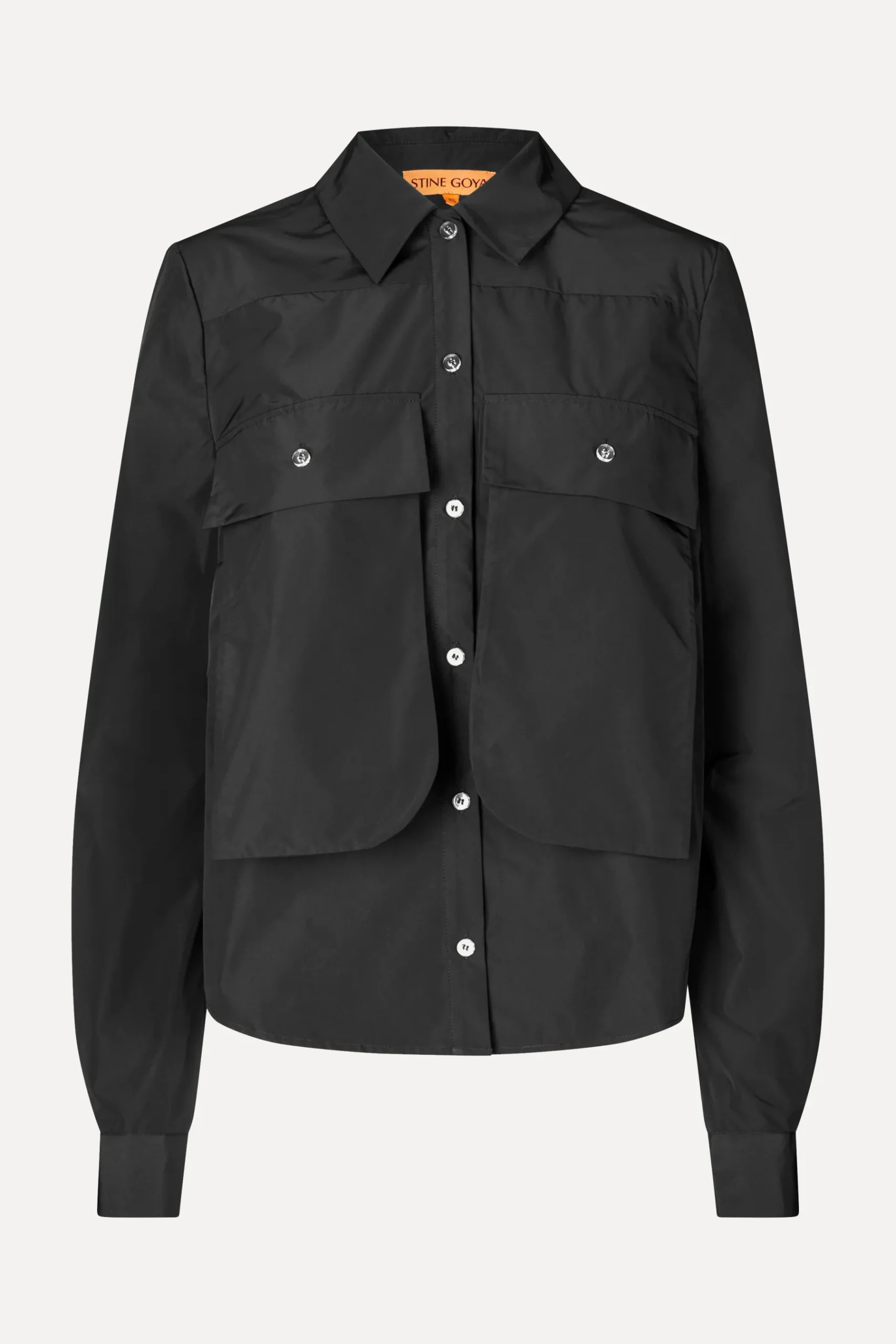 Simple button up top with long cuffed sleeves, oversized patch pockets on the chest and lustred technical material. Pair with the SGChrissy Pants in Jet Black.