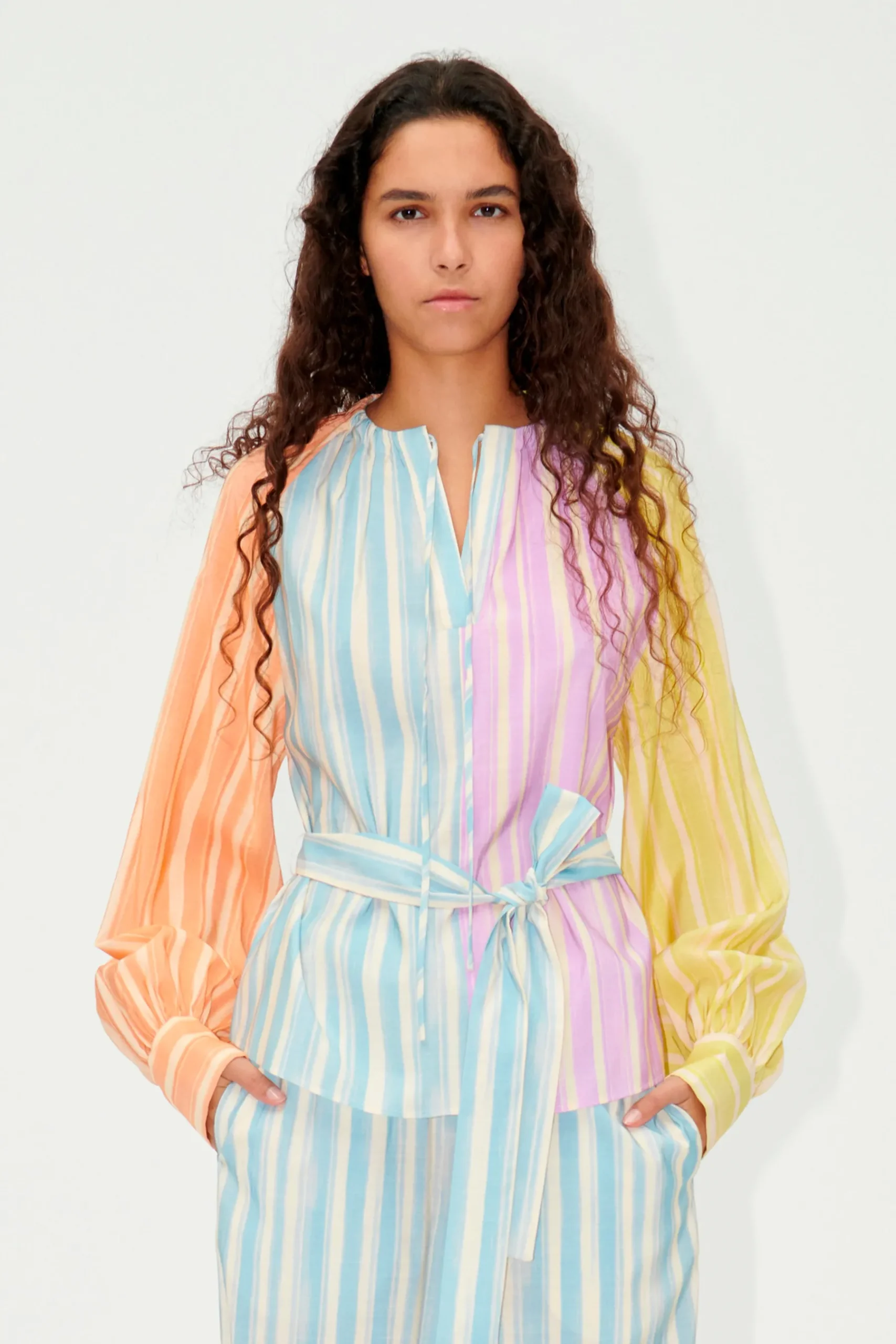 Colourful striped blouse with long cuffed sleeves, V-neck with tie detail and cinchable waist with tie belt. Pair with the SGEmi Pants in Summer Stripes.