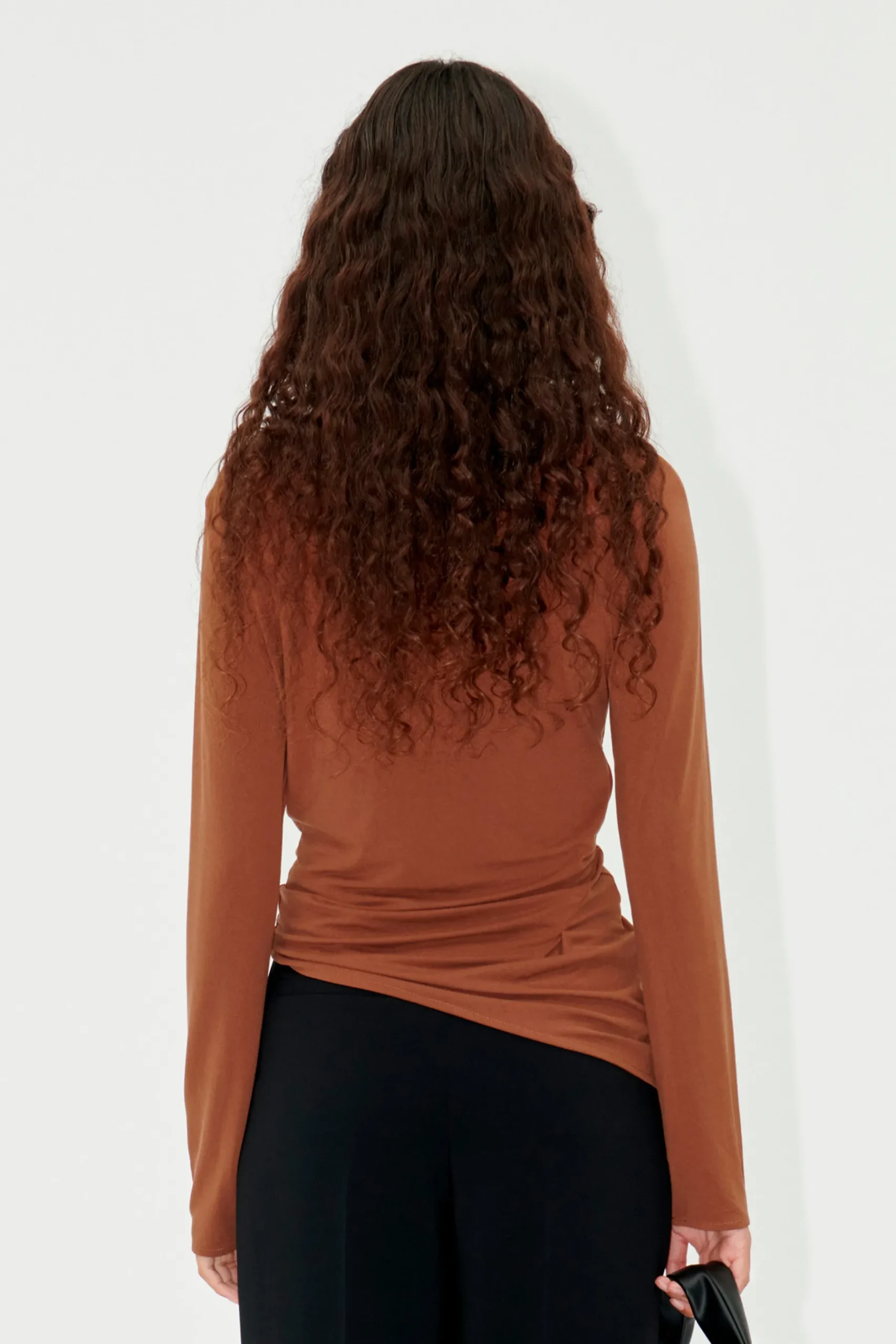 Modern slouched top with long slightly flared sleeves, boat neckline and draped asymmetrical hem. Gold buckle detail. Pair with the SGAsha Pants in Jet Black.