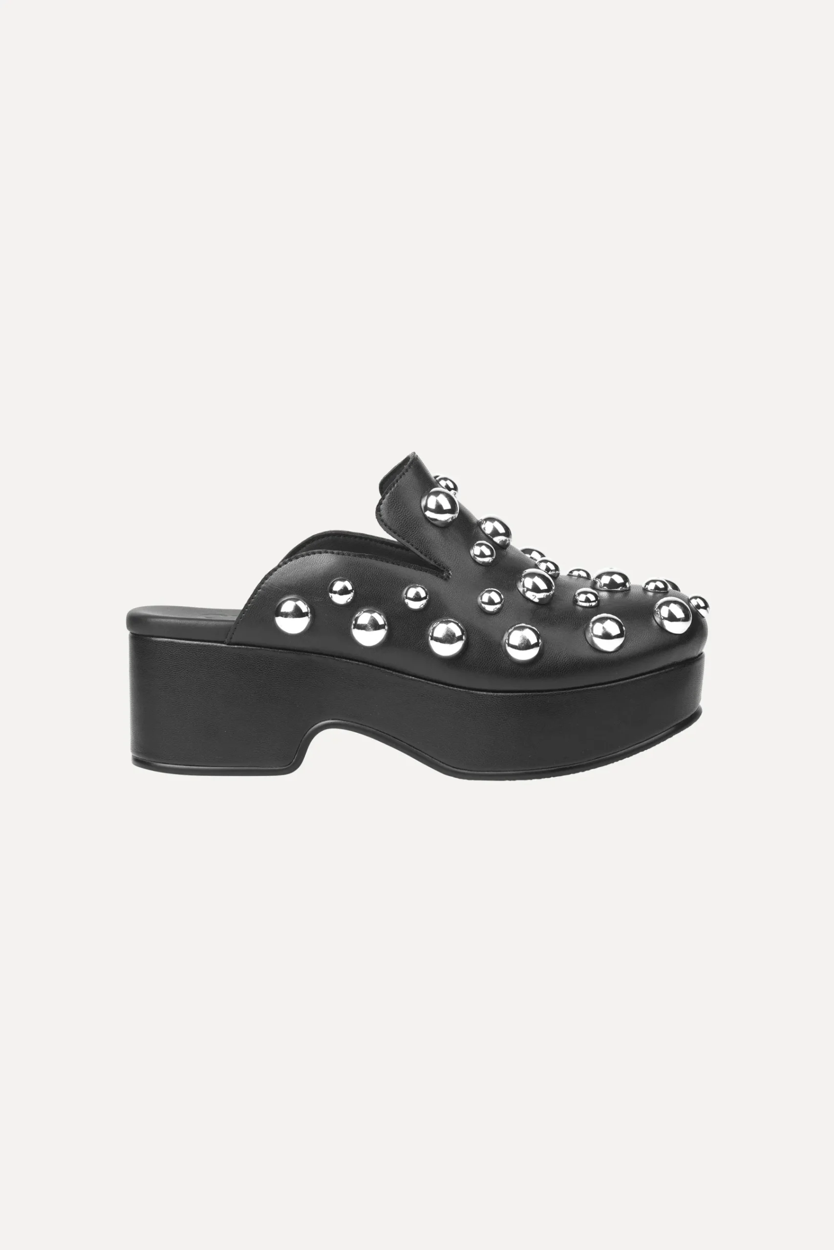 Edgy slip on platform clogs with comfortable block heel, soft durable material and rounded silver studs. Pair with your favourite look from the collection.
