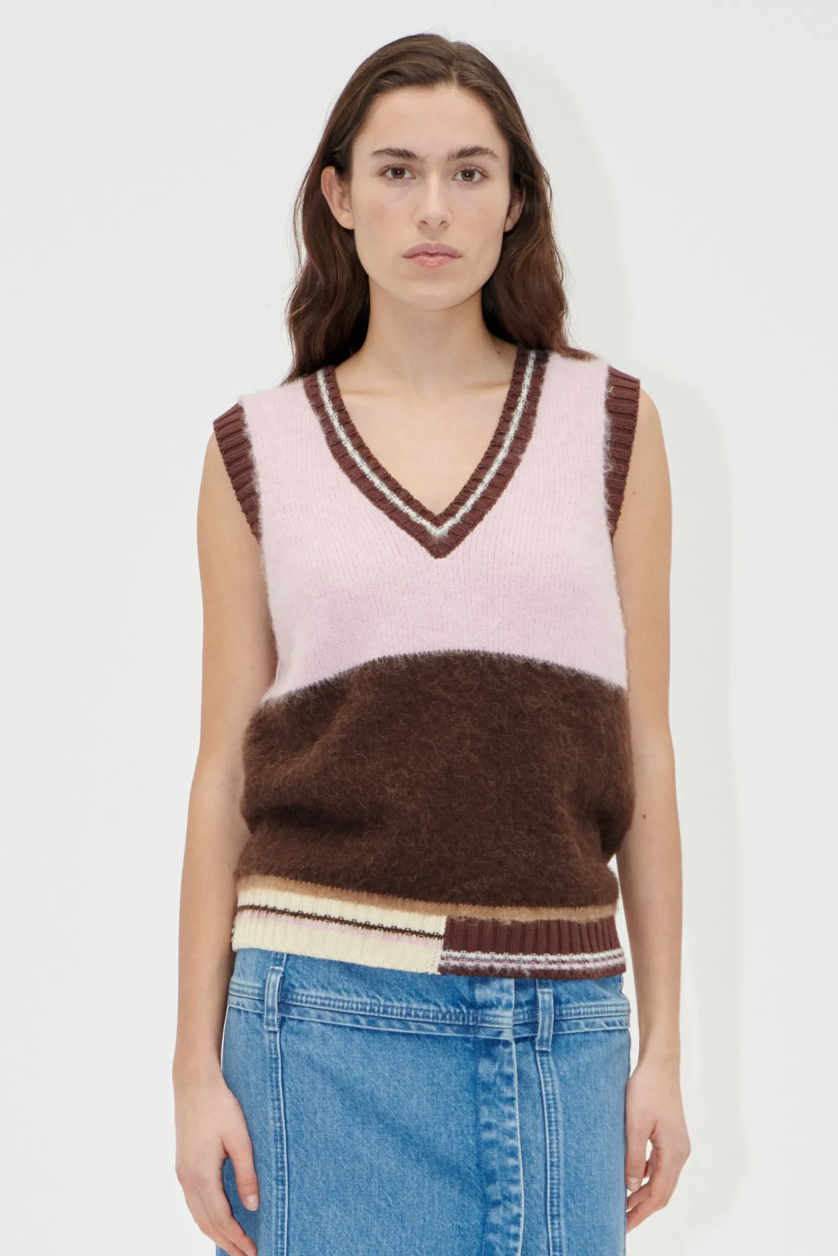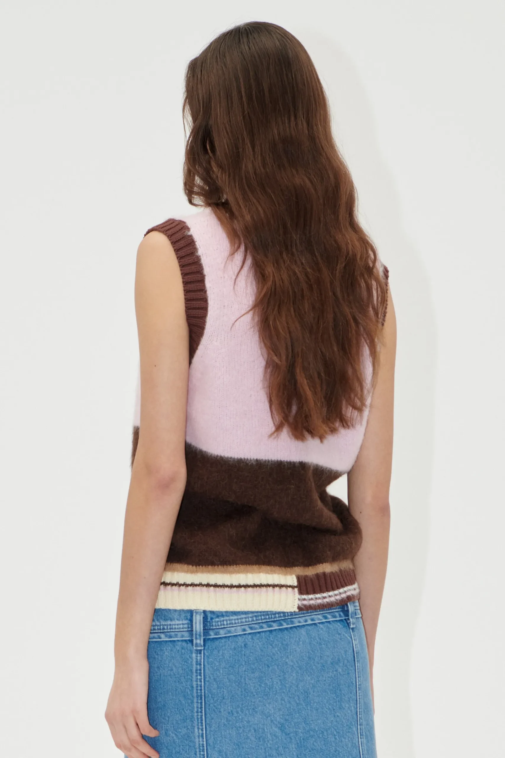 Soft and fluffy sleeveless knit vest with a relaxed fit, V-neck collar, and ribbed hem featuring striped details. Pair it with the Button Slit Detail Midi Skirt.